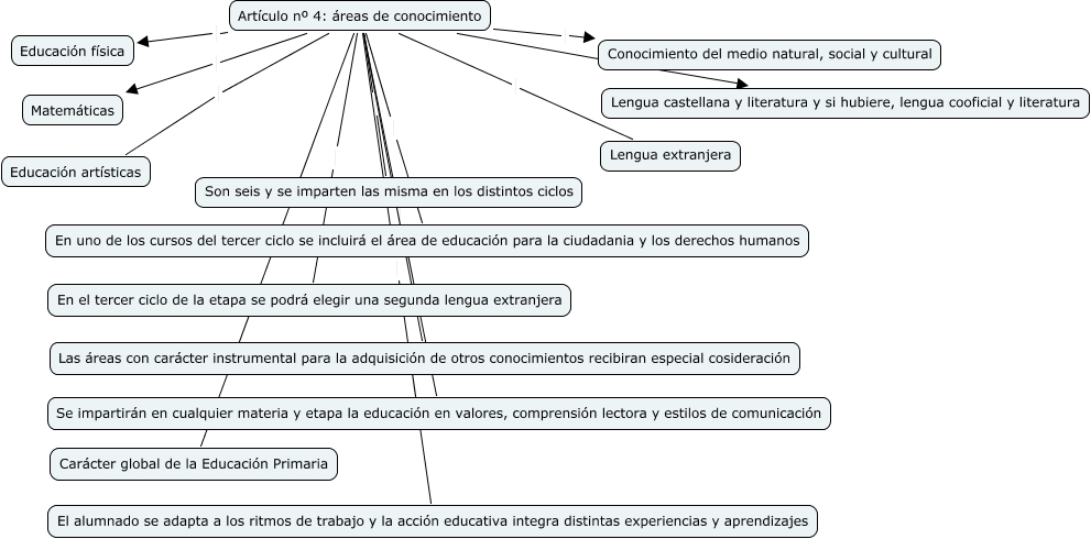 Este Cmap, tiene información relacionada con: articulo 4, Artículo nº 4: áreas de conocimiento Son seis y se imparten las misma en los distintos ciclos, Artículo nº 4: áreas de conocimiento ???? Las áreas con carácter instrumental para la adquisición de otros conocimientos recibiran especial cosideración, Artículo nº 4: áreas de conocimiento Conocimiento del medio natural, social y cultural, Artículo nº 4: áreas de conocimiento Lengua extranjera, Artículo nº 4: áreas de conocimiento En el tercer ciclo de la etapa se podrá elegir una segunda lengua extranjera, Artículo nº 4: áreas de conocimiento En uno de los cursos del tercer ciclo se incluirá el área de educación para la ciudadania y los derechos humanos, Artículo nº 4: áreas de conocimiento El alumnado se adapta a los ritmos de trabajo y la acción educativa integra distintas experiencias y aprendizajes, Artículo nº 4: áreas de conocimiento Educación física, Artículo nº 4: áreas de conocimiento ???? Carácter global de la Educación Primaria, Artículo nº 4: áreas de conocimiento Educación artísticas, Artículo nº 4: áreas de conocimiento Matemáticas, Artículo nº 4: áreas de conocimiento Lengua castellana y literatura y si hubiere, lengua cooficial y literatura, Artículo nº 4: áreas de conocimiento Se impartirán en cualquier materia y etapa la educación en valores, comprensión lectora y estilos de comunicación