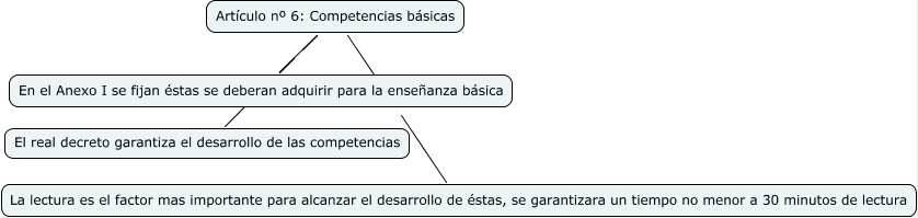 Este Cmap, tiene información relacionada con: articulo 6, Artículo nº 6: Competencias básicas ???? El real decreto garantiza el desarrollo de las competencias, Artículo nº 6: Competencias básicas La lectura es el factor mas importante para alcanzar el desarrollo de éstas, se garantizara un tiempo no menor a 30 minutos de lectura, Artículo nº 6: Competencias básicas En el Anexo I se fijan éstas se deberan adquirir para la enseñanza básica