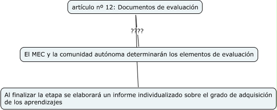 Este Cmap, tiene información relacionada con: articulo 12, artículo nº 12: Documentos de evaluación ???? Al finalizar la etapa se elaborará un informe individualizado sobre el grado de adquisición de los aprendizajes, artículo nº 12: Documentos de evaluación ???? El MEC y la comunidad autónoma determinarán los elementos de evaluación