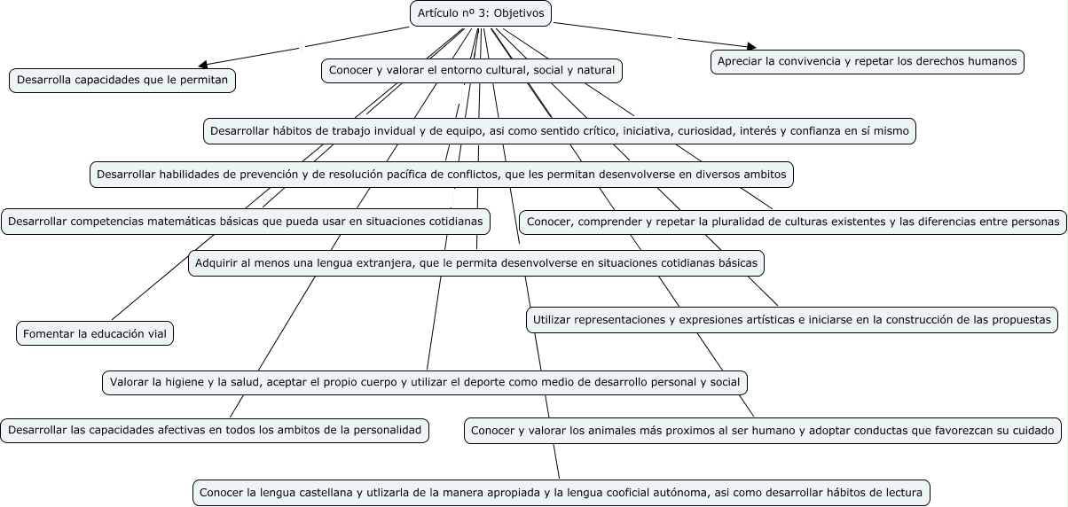 Este Cmap, tiene información relacionada con: articulo 3, Artículo nº 3: Objetivos Desarrollar competencias matemáticas básicas que pueda usar en situaciones cotidianas, Artículo nº 3: Objetivos Desarrolla capacidades que le permitan, Artículo nº 3: Objetivos ???? Fomentar la educación vial, Artículo nº 3: Objetivos Desarrollar habilidades de prevención y de resolución pacífica de conflictos, que les permitan desenvolverse en diversos ambitos, Artículo nº 3: Objetivos Conocer y valorar el entorno cultural, social y natural, Artículo nº 3: Objetivos ???? Desarrollar hábitos de trabajo invidual y de equipo, asi como sentido crítico, iniciativa, curiosidad, interés y confianza en sí mismo, Artículo nº 3: Objetivos Conocer la lengua castellana y utlizarla de la manera apropiada y la lengua cooficial autónoma, asi como desarrollar hábitos de lectura, Artículo nº 3: Objetivos ???? Utilizar representaciones y expresiones artísticas e iniciarse en la construcción de las propuestas, Artículo nº 3: Objetivos Conocer, comprender y repetar la pluralidad de culturas existentes y las diferencias entre personas, Artículo nº 3: Objetivos Apreciar la convivencia y repetar los derechos humanos, Artículo nº 3: Objetivos ???? Adquirir al menos una lengua extranjera, que le permita desenvolverse en situaciones cotidianas básicas, Artículo nº 3: Objetivos ???? Conocer y valorar los animales más proximos al ser humano y adoptar conductas que favorezcan su cuidado, Artículo nº 3: Objetivos Valorar la higiene y la salud, aceptar el propio cuerpo y utilizar el deporte como medio de desarrollo personal y social, Artículo nº 3: Objetivos ???? Desarrollar las capacidades afectivas en todos los ambitos de la personalidad