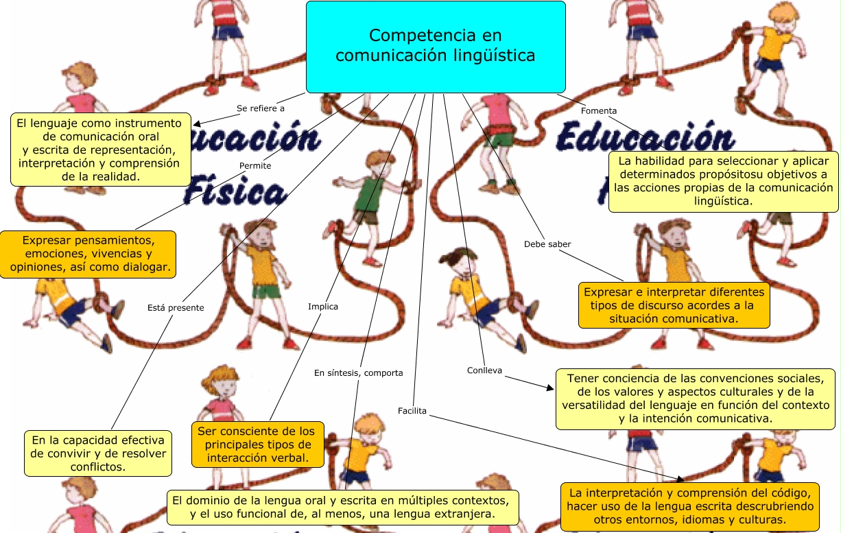 Este Cmap, tiene información relacionada con: Competencia en comunicación lingüística, Competencia en comunicación lingüística Facilita La interpretación y comprensión del código, hacer uso de la lengua escrita descrubriendo otros entornos, idiomas y culturas., Competencia en comunicación lingüística Se refiere a El lenguaje como instrumento de comunicación oral y escrita de representación, interpretación y comprensión de la realidad., Competencia en comunicación lingüística Está presente En la capacidad efectiva de convivir y de resolver conflictos., Competencia en comunicación lingüística En síntesis, comporta El dominio de la lengua oral y escrita en múltiples contextos, y el uso funcional de, al menos, una lengua extranjera., Competencia en comunicación lingüística Conlleva Tener conciencia de las convenciones sociales, de los valores y aspectos culturales y de la versatilidad del lenguaje en función del contexto y la intención comunicativa., Competencia en comunicación lingüística Fomenta La habilidad para seleccionar y aplicar determinados propósitosu objetivos a las acciones propias de la comunicación lingüística., Competencia en comunicación lingüística Implica Ser consciente de los principales tipos de interacción verbal., Competencia en comunicación lingüística Debe saber Expresar e interpretar diferentes tipos de discurso acordes a la situación comunicativa., Competencia en comunicación lingüística Permite Expresar pensamientos, emociones, vivencias y opiniones, así como dialogar.