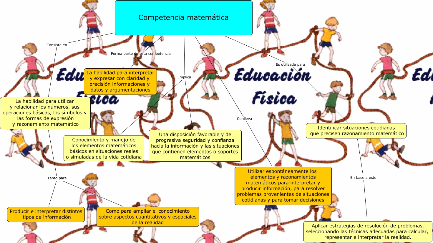 Este Cmap, tiene información relacionada con: Competencia matemática, Competencia matemática Es utilizada para Identificar situaciones cotidianas que precisen razonamiento matemático, Identificar situaciones cotidianas que precisen razonamiento matemático En base a esto Aplicar estrategias de resolución de problemas. seleccionando las técnicas adecuadas para calcular, representar e interpretar la realidad., Competencia matemática Implica Conocimiento y manejo de los elementos matemáticos básicos en situaciones reales o simuladas de la vida cotidiana, Competencia matemática Conlleva Utilizar espontáneamente los elementos y razonamientos matemáticos para interpretar y producir información, para resolver problemas provenientes de situaciones cotidianas y para tomar decisiones, La habilidad para utilizar y relacionar los números, sus operaciones básicas, los símbolos y las formas de expresión y razonamiento matemático Tanto para Producir e interpretar distintos tipos de información, Competencia matemática Consiste en La habilidad para utilizar y relacionar los números, sus operaciones básicas, los símbolos y las formas de expresión y razonamiento matemático, Competencia matemática Forma parte de esta competencia La habilidad para interpretar y expresar con claridad y precisión informaciones y datos y argumentaciones, La habilidad para utilizar y relacionar los números, sus operaciones básicas, los símbolos y las formas de expresión y razonamiento matemático Tanto para Como para ampliar el conocimiento sobre aspectos cuantitativos y espaciales de la realidad, Competencia matemática Implica Una disposición favorable y de progresiva seguridad y confianza hacia la información y las situaciones que contienen elementos o soportes matemáticos