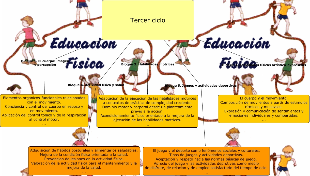 Este Cmap, tiene información relacionada con: Tercer ciclo, Tercer ciclo Bloque 4. Actividad física y salud Adquisición de hábitos posturales y alimentarios saludables. Mejora de la condición física orientada a la salud. Prevencion de lesiones en la actividad física. Valoración de la actividad física para el mantenimiento y la mejora de la salud. ..., Tercer ciclo Bloque 5. Juegos y actividades deportivas El juego y el deporte como fenómenos sociales y culturales. Tipos de juegos y actividades deportivas. Aceptación y respeto hacia las normas básicas de juego. Aprecio del juego y las actividades deprotivas como medio de disfrute, de relación y de empleo satisfactorio del tiempo de ocio. ..., Tercer ciclo Bloque 2. Habilidades motrices Adaptación de la ejecución de las habilidades motrices a contextos de práctica de complejidad creciente. Dominio motor y corporal desde un planteamiento previo a la acción. Acondicionamiento físico orientado a la mejora de la ejecución de las habilidades motrices. ..., Tercer ciclo Bloque 1. El cuerpo: imagen y percepción Elementos orgánicos-funcionales relacionados con el movimiento. Conciencia y control del cuerpo en reposo y en movimiento. Aplicación del control tónico y de la respiración al control motor. ..., Tercer ciclo Bloque 3. Actividades físicas artístico-expresivas El cuerpo y el movimiento. Composición de moviientos a partir de estímulos rítmicos y musicales. Expresión y comunicación de sentimientos y emociones individuales y compartidas. ...