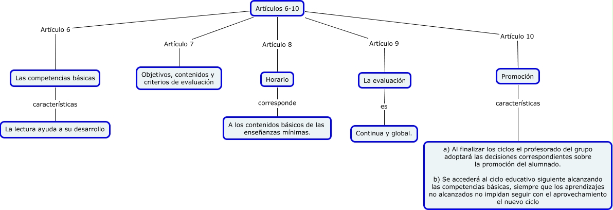 Este Cmap, tiene información relacionada con: Artículos 6-10, Artículos 6-10 Artículo 7 Objetivos, contenidos y criterios de evaluación, Artículos 6-10 Artículo 9 La evaluación, Promoción características a) Al finalizar los ciclos el profesorado del grupo adoptará las decisiones correspondientes sobre la promoción del alumnado. b) Se accederá al ciclo educativo siguiente alcanzando las competencias básicas, siempre que los aprendizajes no alcanzados no impidan seguir con el aprovechamiento el nuevo ciclo, Las competencias básicas características La lectura ayuda a su desarrollo, Artículos 6-10 Artículo 8 Horario, La evaluación es Continua y global., Artículos 6-10 Artículo 10 Promoción, Artículos 6-10 Artículo 6 Las competencias básicas, Horario corresponde A los contenidos básicos de las enseñanzas mínimas.