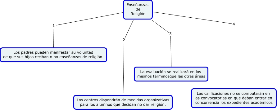 Este Cmap, tiene información relacionada con: Enseñanzas de religión, Enseñanzas de Religión 3 La evaluación se realizará en los mismos términosque las otras áreas, Enseñanzas de Religión 2 Los centros dispondrán de medidas organizativas para los alumnos que decidan no dar religión., Enseñanzas de Religión 1 Los padres pueden manifestar su voluntad de que sus hijos reciban o no enseñanzas de religión., Enseñanzas de Religión 4 Las calificaciones no se computarán en las convocatorias en que deban entrar en concurrencia los expedientes académicos