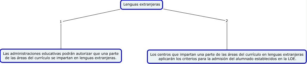 Este Cmap, tiene información relacionada con: Lenguas extranjeras, Lenguas extranjeras 1 Las administraciones educativas podrán autorizar que una parte de las áreas del currículo se impartan en lenguas extranjeras., Lenguas extranjeras 2 Los centros que impartan una parte de las áreas del currículo en lenguas extranjeras aplicarán los criterios para la admisión del alumnado establecidos en la LOE.