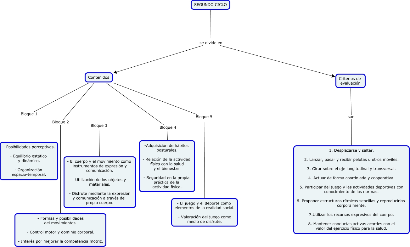 Este Cmap, tiene información relacionada con: Segundo ciclo, Contenidos Bloque 3 - El cuerpo y el movimiento como instrumentos de expresión y comunicación. - Utilización de los objetos y materiales. - Disfrute mediante la expresión y comunicación a través del propio cuerpo., Contenidos Bloque 2 - Formas y posibilidades del movimientos. - Control motor y dominio corporal. - Interés por mejorar la competencia motriz., Contenidos Bloque 1 - Posibilidades perceptivas. - Equilibrio estático y dinámico. - Organización espacio-temporal., Contenidos Bloque 4 -Adquisición de hábitos posturales. - Relación de la actividad física con la salud y el bienestar. - Seguridad en la propia práctica de la actividad física., Criterios de evaluación son 1. Desplazarse y saltar. 2. Lanzar, pasar y recibir pelotas u otros móviles. 3. Girar sobre el eje longitudinal y transversal. 4. Actuar de forma coordniada y cooperativa. 5. Participar del juego y las actividades deportivas con conocimiento de las normas. 6. Proponer estructuras rítmicas sencillas y reproducirlas corporalmente. 7.Utilizar los recursos expresivos del cuerpo. 8. Mantener conductas activas acordes con el valor del ejercicio físico para la salud., SEGUNDO CICLO se divide en Criterios de evaluación, SEGUNDO CICLO se divide en Contenidos, Contenidos Bloque 5 - El juego y el deporte como elementos de la realidad social. - Valoración del juego como medio de disfrute.