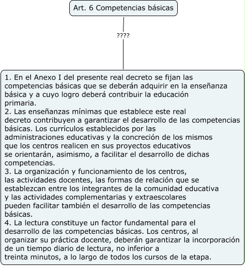 Este Cmap, tiene información relacionada con: 6, Art. 6 Competencias básicas ???? 1. En el Anexo I del presente real decreto se fijan las competencias básicas que se deberán adquirir en la enseñanza básica y a cuyo logro deberá contribuir la educación primaria. 2. Las enseñanzas mínimas que establece este real decreto contribuyen a garantizar el desarrollo de las competencias básicas. Los currículos establecidos por las administraciones educativas y la concreción de los mismos que los centros realicen en sus proyectos educativos se orientarán, asimismo, a facilitar el desarrollo de dichas competencias. 3. La organización y funcionamiento de los centros, las actividades docentes, las formas de relación que se establezcan entre los integrantes de la comunidad educativa y las actividades complementarias y extraescolares pueden facilitar también el desarrollo de las competencias básicas. 4. La lectura constituye un factor fundamental para el desarrollo de las competencias básicas. Los centros, al organizar su práctica docente, deberán garantizar la incorporación de un tiempo diario de lectura, no inferior a treinta minutos, a lo largo de todos los cursos de la etapa.