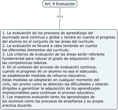 Este Cmap, tiene información relacionada con: 9, Art. 9 Evaluación ???? 1. La evaluación de los procesos de aprendizaje del alumnado será continua y global y tendrá en cuenta el progreso del alumno en el conjunto de las áreas del currículo. 2. La evaluación se llevará a cabo teniendo en cuenta los diferentes elementos del currículo. 3. Los criterios de evaluación de las áreas serán referente fundamental para valorar el grado de adquisición de las competencias básicas. 4. En el contexto del proceso de evaluación continua, cuando el progreso de un alumno no sea el adecuado, se establecerán medidas de refuerzo educativo. Estas medidas se adoptarán en cualquier momento del ciclo, tan pronto como se detecten las dificultades y estarán dirigidas a garantizar la adquisición de los aprendizajes imprescindibles para continuar el proceso educativo. 5. Los maestros evaluarán tanto los aprendizajes de los alumnos como los procesos de enseñanza y su propia práctica docente.