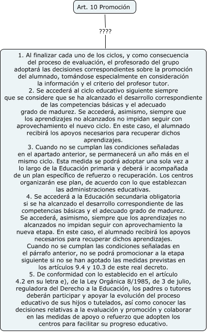 Este Cmap, tiene información relacionada con: 10, Art. 10 Promoción ???? 1. Al finalizar cada uno de los ciclos, y como consecuencia del proceso de evaluación, el profesorado del grupo adoptará las decisiones correspondientes sobre la promoción del alumnado, tomándose especialmente en consideración la información y el criterio del profesor tutor. 2. Se accederá al ciclo educativo siguiente siempre que se considere que se ha alcanzado el desarrollo correspondiente de las competencias básicas y el adecuado grado de madurez. Se accederá, asimismo, siempre que los aprendizajes no alcanzados no impidan seguir con aprovechamiento el nuevo ciclo. En este caso, el alumnado recibirá los apoyos necesarios para recuperar dichos aprendizajes. 3. Cuando no se cumplan las condiciones señaladas en el apartado anterior, se permanecerá un año más en el mismo ciclo. Esta medida se podrá adoptar una sola vez a lo largo de la Educación primaria y deberá ir acompañada de un plan específico de refuerzo o recuperación. Los centros organizarán ese plan, de acuerdo con lo que establezcan las administraciones educativas. 4. Se accederá a la Educación secundaria obligatoria si se ha alcanzado el desarrollo correspondiente de las competencias básicas y el adecuado grado de madurez. Se accederá, asimismo, siempre que los aprendizajes no alcanzados no impidan seguir con aprovechamiento la nueva etapa. En este caso, el alumnado recibirá los apoyos necesarios para recuperar dichos aprendizajes. Cuando no se cumplan las condiciones señaladas en el párrafo anterior, no se podrá promocionar a la etapa siguiente si no se han agotado las medidas previstas en los artículos 9.4 y 10.3 de este real decreto. 5. De conformidad con lo establecido en el artículo 4.2 en su letra e), de la Ley Orgánica 8/1985, de 3 de julio, reguladora del Derecho a la Educación, los padres o tutores deberán participar y apoyar la evolución del proceso educativo de sus hijos o tutelados, así como conocer las decisiones relativas a la evaluación y promoción y colaborar en las medidas de apoyo o refuerzo que adopten los centros para facilitar su progreso educativo.