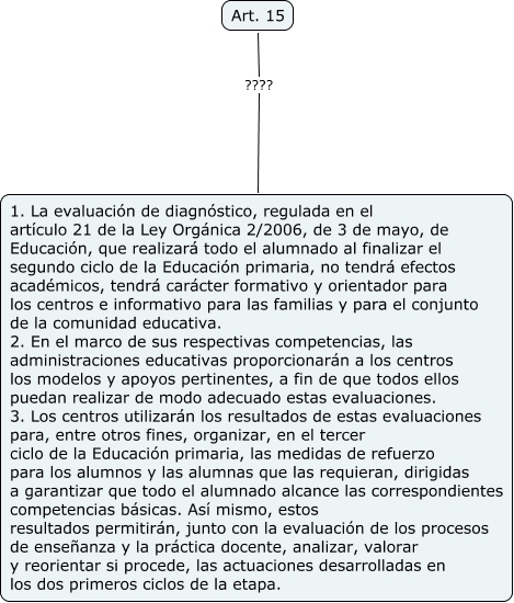 Este Cmap, tiene información relacionada con: 15, Art. 15 ???? 1. La evaluación de diagnóstico, regulada en el artículo 21 de la Ley Orgánica 2/2006, de 3 de mayo, de Educación, que realizará todo el alumnado al finalizar el segundo ciclo de la Educación primaria, no tendrá efectos académicos, tendrá carácter formativo y orientador para los centros e informativo para las familias y para el conjunto de la comunidad educativa. 2. En el marco de sus respectivas competencias, las administraciones educativas proporcionarán a los centros los modelos y apoyos pertinentes, a fin de que todos ellos puedan realizar de modo adecuado estas evaluaciones. 3. Los centros utilizarán los resultados de estas evaluaciones para, entre otros fines, organizar, en el tercer ciclo de la Educación primaria, las medidas de refuerzo para los alumnos y las alumnas que las requieran, dirigidas a garantizar que todo el alumnado alcance las correspondientes competencias básicas. Así mismo, estos resultados permitirán, junto con la evaluación de los procesos de enseñanza y la práctica docente, analizar, valorar y reorientar si procede, las actuaciones desarrolladas en los dos primeros ciclos de la etapa.