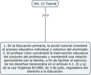 Este Cmap, tiene información relacionada con: 11, Art. 11 Tutoría ???? 1. En la Educación primaria, la acción tutorial orientará el proceso educativo individual y colectivo del alumnado. 2. El profesor tutor coordinará la intervención educativa del conjunto del profesorado y mantendrá una relación permanente con la familia, a fin de facilitar el ejercicio de los derechos reconocidos en el artículo 4.1. d) y g) de la Ley Orgánica 8/1985, de 3 de julio, reguladora del Derecho a la Educación.