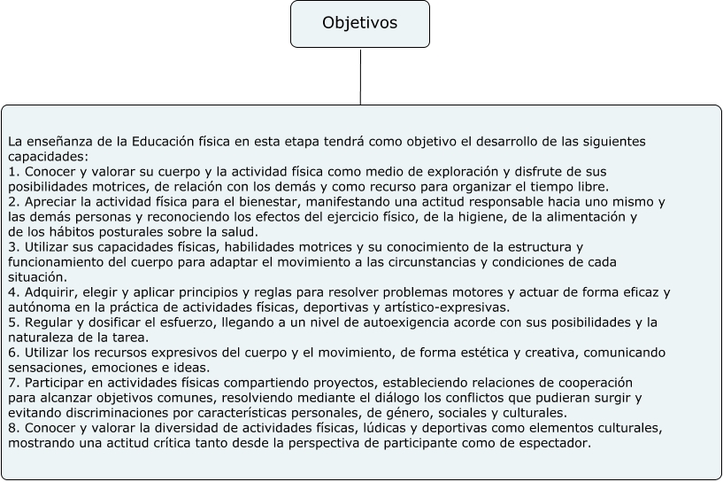 Este Cmap, tiene información relacionada con: Objetivos, Objetivos ???? La enseñanza de la Educación física en esta etapa tendrá como objetivo el desarrollo de las siguientes capacidades: 1. Conocer y valorar su cuerpo y la actividad física como medio de exploración y disfrute de sus posibilidades motrices, de relación con los demás y como recurso para organizar el tiempo libre. 2. Apreciar la actividad física para el bienestar, manifestando una actitud responsable hacia uno mismo y las demás personas y reconociendo los efectos del ejercicio físico, de la higiene, de la alimentación y de los hábitos posturales sobre la salud. 3. Utilizar sus capacidades físicas, habilidades motrices y su conocimiento de la estructura y funcionamiento del cuerpo para adaptar el movimiento a las circunstancias y condiciones de cada situación. 4. Adquirir, elegir y aplicar principios y reglas para resolver problemas motores y actuar de forma eficaz y autónoma en la práctica de actividades físicas, deportivas y artístico-expresivas. 5. Regular y dosificar el esfuerzo, llegando a un nivel de autoexigencia acorde con sus posibilidades y la naturaleza de la tarea. 6. Utilizar los recursos expresivos del cuerpo y el movimiento, de forma estética y creativa, comunicando sensaciones, emociones e ideas. 7. Participar en actividades físicas compartiendo proyectos, estableciendo relaciones de cooperación para alcanzar objetivos comunes, resolviendo mediante el diálogo los conflictos que pudieran surgir y evitando discriminaciones por características personales, de género, sociales y culturales. 8. Conocer y valorar la diversidad de actividades físicas, lúdicas y deportivas como elementos culturales, mostrando una actitud crítica tanto desde la perspectiva de participante como de espectador.