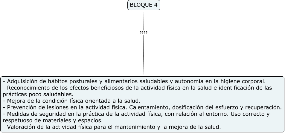 Este Cmap, tiene información relacionada con: Sin Título 29, BLOQUE 4 ???? - Adquisición de hábitos posturales y alimentarios saludables y autonomía en la higiene corporal. - Reconocimiento de los efectos beneficiosos de la actividad física en la salud e identificación de las prácticas poco saludables. - Mejora de la condición física orientada a la salud. - Prevención de lesiones en la actividad física. Calentamiento, dosificación del esfuerzo y recuperación. - Medidas de seguridad en la práctica de la actividad física, con relación al entorno. Uso correcto y respetuoso de materiales y espacios. - Valoración de la actividad física para el mantenimiento y la mejora de la salud.