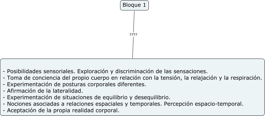 Este Cmap, tiene información relacionada con: Sin Título 13, Bloque 1 ???? - Posibilidades sensoriales. Exploración y discriminación de las sensaciones. - Toma de conciencia del propio cuerpo en relación con la tensión, la relajación y la respiración. - Experimentación de posturas corporales diferentes. - Afirmación de la lateralidad. - Experimentación de situaciones de equilibrio y desequilibrio. - Nociones asociadas a relaciones espaciales y temporales. Percepción espacio-temporal. - Aceptación de la propia realidad corporal.