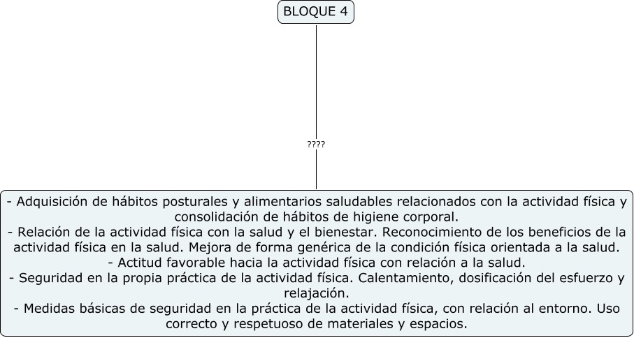 Este Cmap, tiene información relacionada con: Sin Título 24, BLOQUE 4 ???? - Adquisición de hábitos posturales y alimentarios saludables relacionados con la actividad física y consolidación de hábitos de higiene corporal. - Relación de la actividad física con la salud y el bienestar. Reconocimiento de los beneficios de la actividad física en la salud. Mejora de forma genérica de la condición física orientada a la salud. - Actitud favorable hacia la actividad física con relación a la salud. - Seguridad en la propia práctica de la actividad física. Calentamiento, dosificación del esfuerzo y relajación. - Medidas básicas de seguridad en la práctica de la actividad física, con relación al entorno. Uso correcto y respetuoso de materiales y espacios.