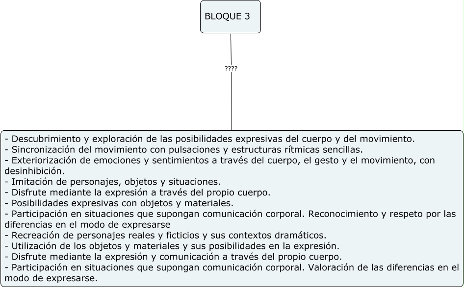 Este Cmap, tiene información relacionada con: Sin Título 23, BLOQUE 3 ???? - Descubrimiento y exploración de las posibilidades expresivas del cuerpo y del movimiento. - Sincronización del movimiento con pulsaciones y estructuras rítmicas sencillas. - Exteriorización de emociones y sentimientos a través del cuerpo, el gesto y el movimiento, con desinhibición. - Imitación de personajes, objetos y situaciones. - Disfrute mediante la expresión a través del propio cuerpo. - Posibilidades expresivas con objetos y materiales. - Participación en situaciones que supongan comunicación corporal. Reconocimiento y respeto por las diferencias en el modo de expresarse - Recreación de personajes reales y ficticios y sus contextos dramáticos. - Utilización de los objetos y materiales y sus posibilidades en la expresión. - Disfrute mediante la expresión y comunicación a través del propio cuerpo. - Participación en situaciones que supongan comunicación corporal. Valoración de las diferencias en el modo de expresarse.
