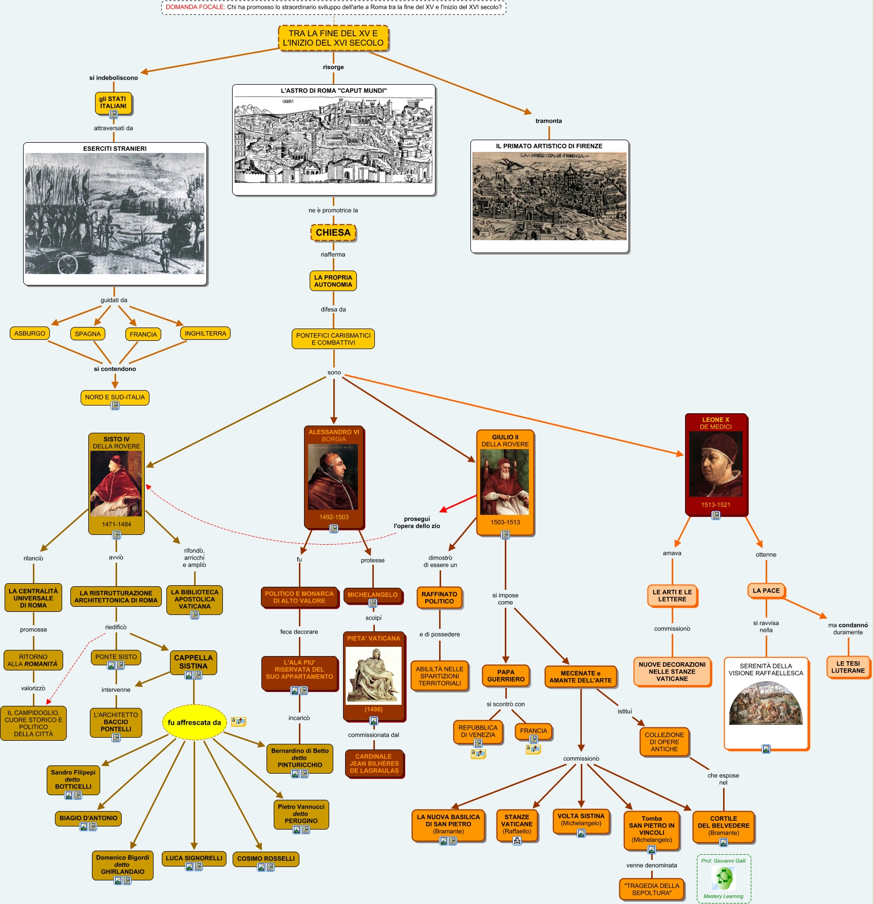Questa Cmap, creata con IHMC CmapTools, contiene informazioni relative a: Roma pontificia tra Quattro e Cinquecento, ALESSANDRO VI BORGIA 1492-1503 protesse MICHELANGELO, INGHILTERRA si contendono NORD E SUD-ITALIA, ASBURGO si contendono NORD E SUD-ITALIA, MECENATE e AMANTE DELL'ARTE commissionò CORTILE DEL BELVEDERE (Bramante), TRA LA FINE DEL XV E L'INIZIO DEL XVI SECOLO tramonta IL PRIMATO ARTISTICO DI FIRENZE, GIULIO II DELLA ROVERE 1503-1513 si impose come MECENATE e AMANTE DELL'ARTE, LEONE X DE MEDICI 1513-1521 amava LE ARTI E LE LETTERE, SISTO IV DELLA ROVERE 1471-1484 avviò LA RISTRUTTURAZIONE ARCHITETTONICA DI ROMA, FRANCIA si contendono NORD E SUD-ITALIA, GIULIO II DELLA ROVERE 1503-1513 si impose come PAPA GUERRIERO, LE ARTI E LE LETTERE commissionò NUOVE DECORAZIONI NELLE STANZE VATICANE, DOMANDA FOCALE: Chi ha promosso lo straordinario sviluppo dell'arte a Roma tra la fine del XV e l'inizio del XVI secolo? ???? TRA LA FINE DEL XV E L'INIZIO DEL XVI SECOLO, CAPPELLA SISTINA intervenne L'ARCHITETTO BACCIO PONTELLI, ESERCITI STRANIERI guidati da INGHILTERRA, CHIESA riafferma LA PROPRIA AUTONOMIA, MECENATE e AMANTE DELL'ARTE istituì COLLEZIONE DI OPERE ANTICHE, PAPA GUERRIERO si scontrò con REPUBBLICA DI VENEZIA, PONTEFICI CARISMATICI E COMBATTIVI sono SISTO IV DELLA ROVERE 1471-1484, L'ALA PIU' RISERVATA DEL SUO APPARTAMENTO incaricò Bernardino di Betto detto PINTURICCHIO, CAPPELLA SISTINA fu affrescata da LUCA SIGNORELLI