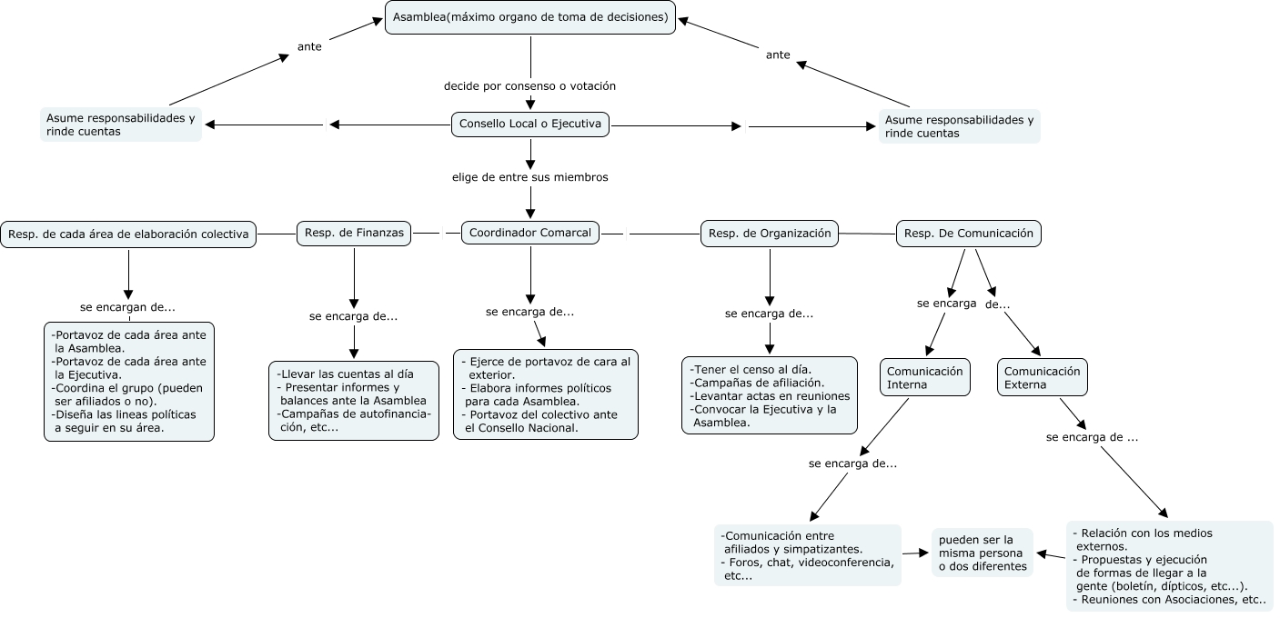 Este Cmap, tiene información relacionada con: Esquema EU, Resp. de Finanzas se encarga de... -Llevar las cuentas al día - Presentar informes y balances ante la Asamblea -Campañas de autofinancia- ción, etc..., -Comunicación entre afiliados y simpatizantes. - Foros, chat, videoconferencia, etc... pueden ser la misma persona o dos diferentes, Resp. de Finanzas Coordinador Comarcal, Resp. de Finanzas ???? Resp. de cada área de elaboración colectiva, Resp. De Comunicación de... Comunicación Externa, Comunicación Externa se encarga de ... - Relación con los medios externos. - Propuestas y ejecución de formas de llegar a la gente (boletín, dípticos, etc...). - Reuniones con Asociaciones, etc.., Asume responsabilidades y rinde cuentas ante Asamblea(máximo organo de toma de decisiones), Resp. De Comunicación se encarga Comunicación Interna, Resp. de Organización se encarga de... -Tener el censo al día. -Campañas de afiliación. -Levantar actas en reuniones -Convocar la Ejecutiva y la Asamblea., Resp. de Organización Resp. De Comunicación, Consello Local o Ejecutiva Asume responsabilidades y rinde cuentas, Coordinador Comarcal Resp. de Organización, Resp. de cada área de elaboración colectiva se encargan de... -Portavoz de cada área ante la Asamblea. -Portavoz de cada área ante la Ejecutiva. -Coordina el grupo (pueden ser afiliados o no). -Diseña las lineas políticas a seguir en su área., Coordinador Comarcal se encarga de... - Ejerce de portavoz de cara al exterior. - Elabora informes políticos para cada Asamblea. - Portavoz del colectivo ante el Consello Nacional., - Relación con los medios externos. - Propuestas y ejecución de formas de llegar a la gente (boletín, dípticos, etc...). - Reuniones con Asociaciones, etc.. pueden ser la misma persona o dos diferentes, Asume responsabilidades y rinde cuentas ante Asamblea(máximo organo de toma de decisiones), Asamblea(máximo organo de toma de decisiones) decide por consenso o votación Consello Local o Ejecutiva, Consello Local o Ejecutiva Asume responsabilidades y rinde cuentas, Consello Local o Ejecutiva elige de entre sus miembros Coordinador Comarcal, Comunicación Interna se encarga de... -Comunicación entre afiliados y simpatizantes. - Foros, chat, videoconferencia, etc...