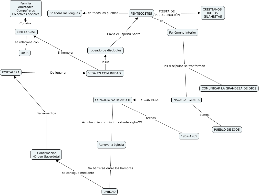 Este Cmap, tiene información relacionada con: TEMA5 (ELISA Y LEYRE), FORTALEZA Da lugar a VIDA EN COMUNIDAD:, rodeado de discípulos Envía el Espiritu Santo PENTECOSTÉS, Fenómeno interior los discípulos se tranforman NACE LA IGLESIA, VIDA EN COMUNIDAD: El hombre SER SOCIAL, -Confirmación -Orden Sacerdotal Sacramentos FORTALEZA, UNIDAD se consigue mediante -Confirmación -Orden Sacerdotal, PENTECOSTÉS FIESTA DE PEREGRINACIÓN CRISTIANOS JUDÍOS ISLAMISTAS, PENTECOSTÉS en todos los pueblos En todas las lenguas, NACE LA IGLESIA Y CON ELLA CONCILIO VATICANO II, Fenómeno interior los discípulos se tranforman COMUNICAR LA GRANDEZA DE DIOS, CONCILIO VATICANO II Acontecimiento más importante siglo-XX Renovó la Iglesia, PENTECOSTÉS es Fenómeno interior, CONCILIO VATICANO II fechas 1962-1965, NACE LA IGLESIA somos PUEBLO DE DIOS, SER SOCIAL Convive Familia Amistades Compañeros Colectivos sociales, VIDA EN COMUNIDAD: Jesús rodeado de discípulos, SER SOCIAL se relaciona con DIOS, Renovó la Iglesia No barreras entre los hombres UNIDAD