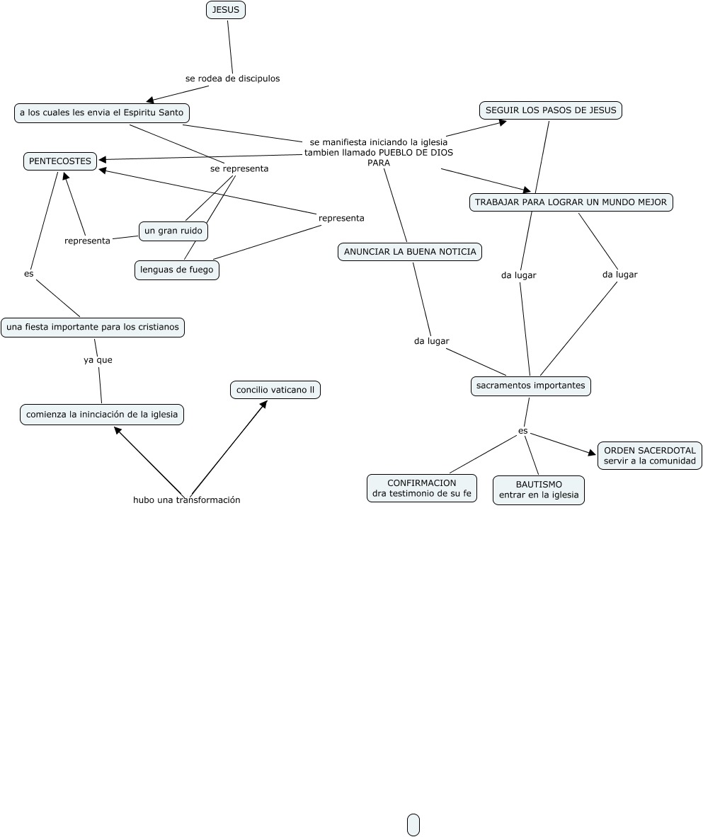 Este Cmap, tiene información relacionada con: Tema 5 (guillermo pedrero javier miranda), a los cuales les envia el Espiritu Santo se representa lenguas de fuego, SEGUIR LOS PASOS DE JESUS da lugar sacramentos importantes, JESUS se rodea de discipulos a los cuales les envia el Espiritu Santo, a los cuales les envia el Espiritu Santo se representa un gran ruido, sacramentos importantes es CONFIRMACION dra testimonio de su fe, a los cuales les envia el Espiritu Santo se manifiesta iniciando la iglesia tambien llamado PUEBLO DE DIOS PARA ANUNCIAR LA BUENA NOTICIA, sacramentos importantes es ORDEN SACERDOTAL servir a la comunidad, PENTECOSTES es una fiesta importante para los cristianos, concilio vaticano ll hubo una transformación comienza la ininciación de la iglesia, lenguas de fuego representa PENTECOSTES, sacramentos importantes es BAUTISMO entrar en la iglesia, ANUNCIAR LA BUENA NOTICIA da lugar sacramentos importantes, una fiesta importante para los cristianos ya que comienza la ininciación de la iglesia, a los cuales les envia el Espiritu Santo se manifiesta iniciando la iglesia tambien llamado PUEBLO DE DIOS PARA TRABAJAR PARA LOGRAR UN MUNDO MEJOR, a los cuales les envia el Espiritu Santo se manifiesta iniciando la iglesia tambien llamado PUEBLO DE DIOS PARA PENTECOSTES, comienza la ininciación de la iglesia concilio vaticano ll, TRABAJAR PARA LOGRAR UN MUNDO MEJOR da lugar sacramentos importantes, a los cuales les envia el Espiritu Santo se manifiesta iniciando la iglesia tambien llamado PUEBLO DE DIOS PARA SEGUIR LOS PASOS DE JESUS, un gran ruido representa PENTECOSTES