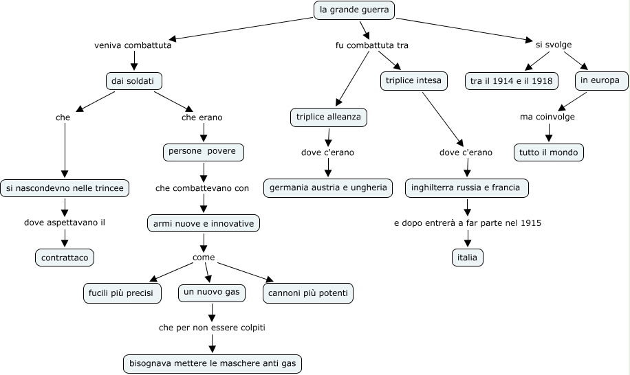 Questa Cmap, creata con IHMC CmapTools, contiene informazioni relative a: grande guerra, la grande guerra veniva combattuta dai soldati, dai soldati che erano persone povere, dai soldati che si nascondevno nelle trincee, armi nuove e innovative come fucili più precisi, la grande guerra si svolge tra il 1914 e il 1918, triplice intesa dove c'erano inghilterra russia e francia, armi nuove e innovative come un nuovo gas, la grande guerra fu combattuta tra triplice intesa, in europa ma coinvolge tutto il mondo, persone povere che combattevano con armi nuove e innovative, un nuovo gas che per non essere colpiti bisognava mettere le maschere anti gas, la grande guerra fu combattuta tra triplice alleanza, inghilterra russia e francia e dopo entrerà a far parte nel 1915 italia, triplice alleanza dove c'erano germania austria e ungheria, si nascondevno nelle trincee dove aspettavano il contrattaco, armi nuove e innovative come cannoni più potenti, la grande guerra si svolge in europa