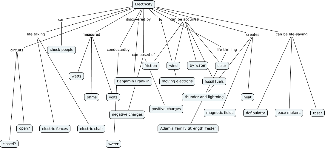 This Concept Map, created with IHMC CmapTools, has information related to: First Look - Electricity - Period E, Electricity can be life-saving defibulator, Electricity circuits open?, Electricity can be acquired fossil fuels, Electricity life thrilling Adam's Family Strength Tester, Electricity life taking electric chair, Electricity can be life-saving taser, Electricity composed of positive charges, Electricity can be acquired friction, Electricity creates heat, Electricity creates magnetic fields, Electricity can be acquired wind, Electricity can be acquired by water, Electricity life taking electric fences, Electricity measured ohms, Electricity can be acquired solar, Electricity can shock people, Electricity measured watts, Electricity is moving electrons, Electricity can be life-saving pace makers, Electricity discovered by Benjamin Franklin