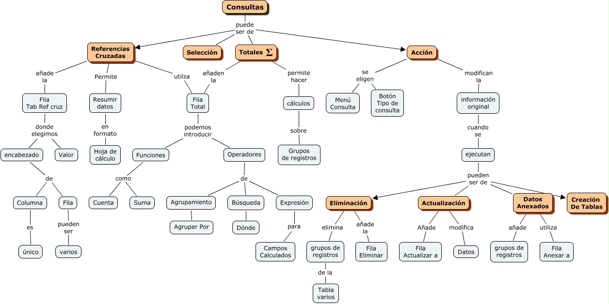 Este Cmap, tiene información relacionada con: Consultas II, Fila Total podemos introducir Operadores, Fila Total podemos introducir Funciones, ejecutan pueden ser de Datos Anexados, Actualización modifica Datos, Datos Anexados utiliza Fila Anexar a, <math xmlns="http://www.w3.org/1998/Math/MathML"> <mrow> <mtext> Totales </mtext> <sum/> </mrow> </math> permite hacer cálculos, Operadores de Expresión, encabezado de Columna, Búsqueda Dónde, Fila Tab Ref cruz donde elegimos encabezado, Funciones como Suma, Acción se eligen Menú Consulta, Eliminación elimina grupos de registros, Acción modifican la información original, Fila Tab Ref cruz donde elegimos Valor, Consultas puede ser de Acción, Acción se eligen Botón Tipo de consulta, Referencias Cruzadas utilza Fila Total, Expresión para Campos Calculados, Datos Anexados añade grupos de registros