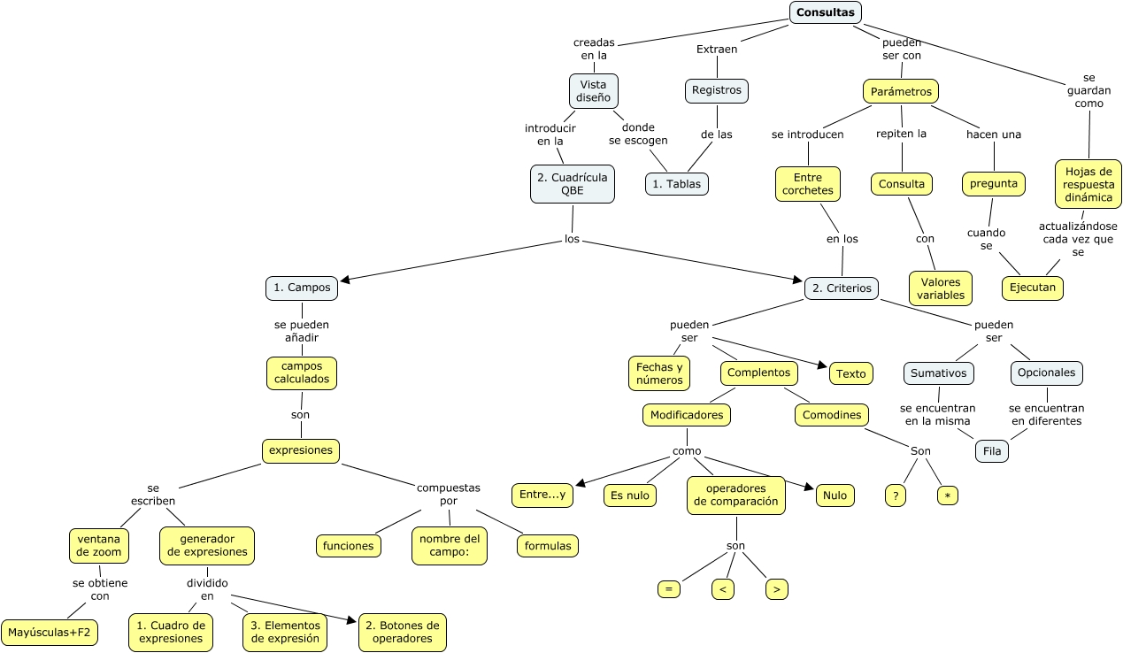 Este Cmap, tiene información relacionada con: Consultas I, operadores de comparación son >, 2. Cuadrícula QBE los 1. Campos, Parámetros repiten la Consulta, Modificadores como Nulo, 2. Criterios pueden ser Complentos, expresiones se escriben generador de expresiones, Hojas de respuesta dinámica actualizándose cada vez que se Ejecutan, Consultas pueden ser con Parámetros, 2. Cuadrícula QBE los 2. Criterios, 2. Criterios pueden ser Fechas y números, 2. Criterios pueden ser Sumativos, Vista diseño donde se escogen 1. Tablas, ventana de zoom se obtiene con Mayúsculas+F2, Parámetros hacen una pregunta, campos calculados son expresiones, Consulta con Valores variables, Consultas Extraen Registros, 2. Criterios pueden ser Opcionales, Consultas creadas en la Vista diseño, Parámetros se introducen Entre corchetes