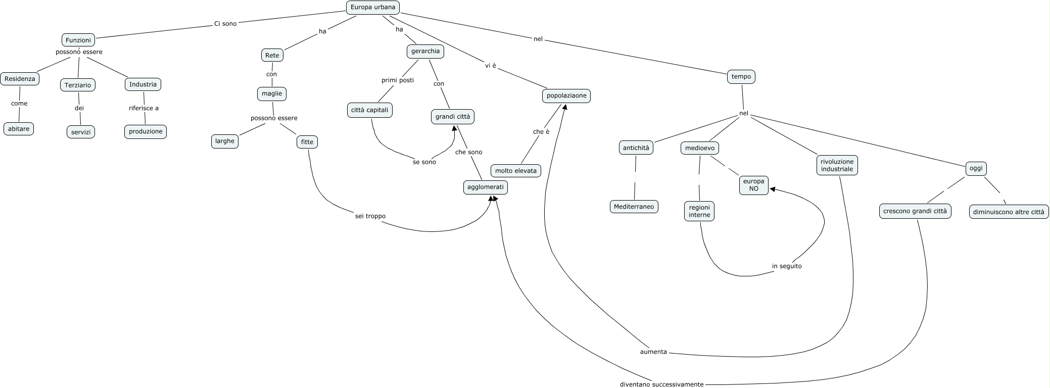 Questa Cmap, creata con IHMC CmapTools, contiene informazioni relative a: europa-urbana, maglie possono essere larghe, crescono grandi città diventano successivamente agglomerati, tempo nel rivoluzione industriale, città capitali se sono grandi città, Rete con maglie, Industria riferisce a produzione, maglie possono essere fitte, Funzioni possono essere Terziario, oggi crescono grandi città, Europa urbana Ci sono Funzioni, Funzioni possono essere Industria, Europa urbana ha gerarchia, tempo nel medioevo, Europa urbana ha Rete, popolaziaone che è molto elevata, medioevo regioni interne, Terziario dei servizi, gerarchia primi posti città capitali, rivoluzione industriale aumenta popolaziaone, Europa urbana vi è popolaziaone