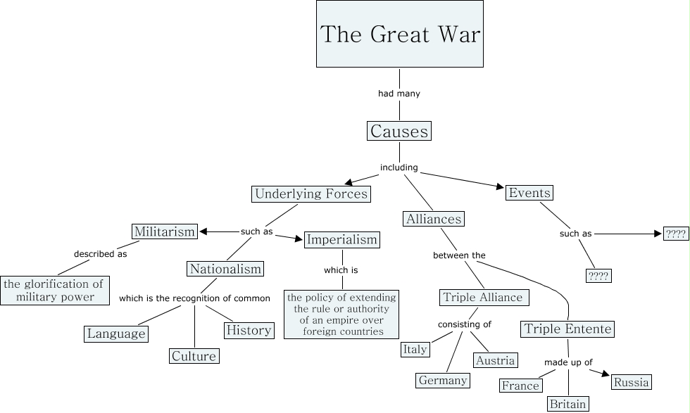 This Concept Map, created with IHMC CmapTools, has information related to: World War I, Nationalism which is the recognition of common Culture, Nationalism which is the recognition of common History, Underlying Forces such as Imperialism, Events such as ????, Nationalism which is the recognition of common Language, Causes including Events, Underlying Forces such as Militarism, Triple Entente made up of France, Triple Entente made up of Russia, Militarism described as the glorification of military power, Causes including Alliances, Causes including Underlying Forces, Underlying Forces such as Nationalism, Events such as ????, Imperialism which is the policy of extending the rule or authority of an empire over foreign countries, Alliances between the Triple Alliance, Alliances between the Triple Entente, Triple Alliance consisting of Germany, Triple Alliance consisting of Italy, The Great War had many Causes