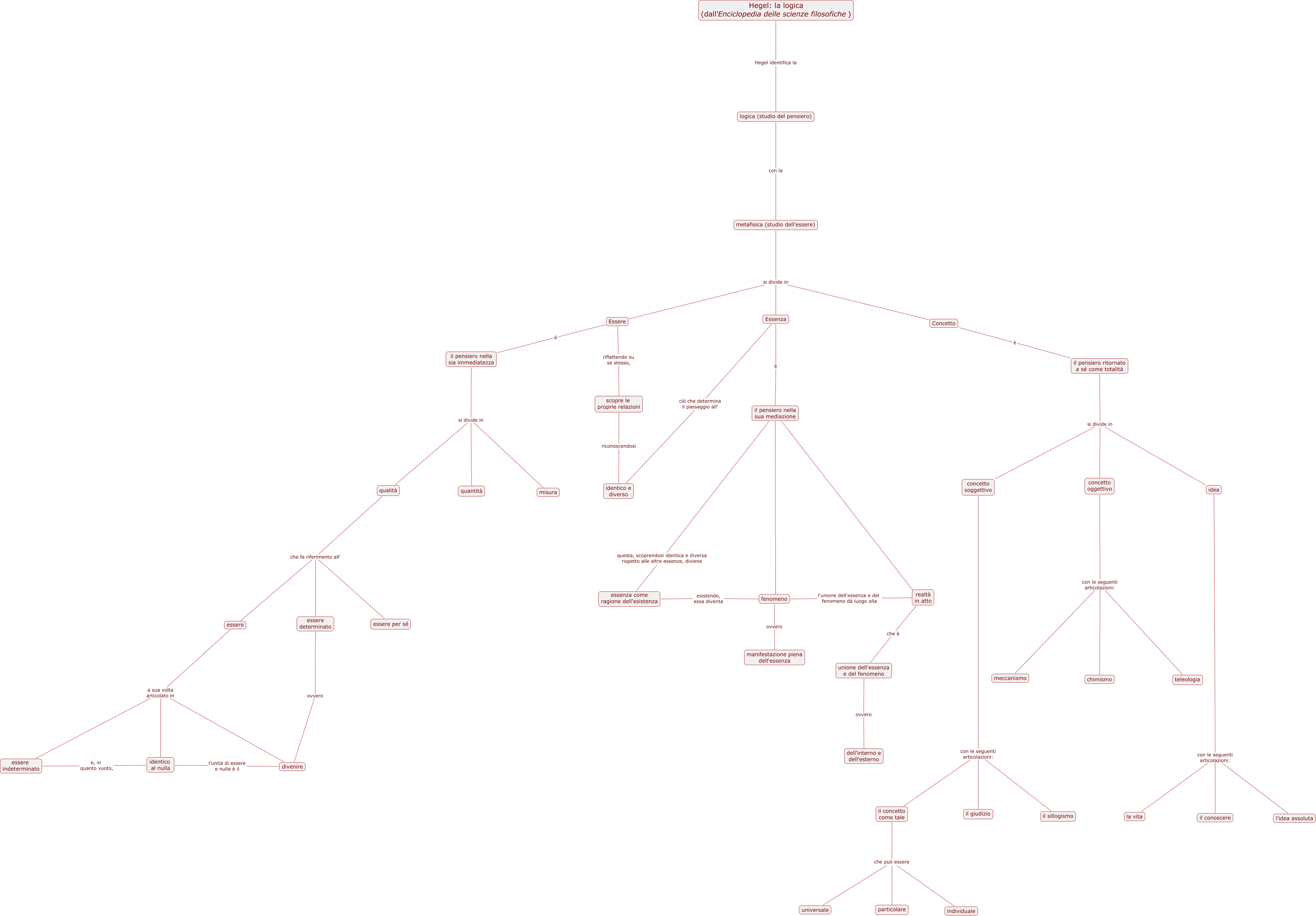 Questa Cmap, creata con IHMC CmapTools, contiene informazioni relative a: Hegel - La logica (dall'Enciclopedia delle scienze filosofiche), Concetto si divide in metafisica (studio dell'essere), logica (studio del pensiero) Hegel identifica la Hegel: la logica (dall'Enciclopedia delle scienze filosofiche), idea si divide in il pensiero ritornato a sé come totalità, il giudizio con le seguenti articolazioni: concetto soggettivo, misura si divide in il pensiero nella sia immediatezza, fenomeno esistendo, essa diventa essenza come ragione dell'esistenza, Essenza si divide in metafisica (studio dell'essere), il pensiero nella sua mediazione è Essenza, individuale che può essere il concetto come tale, dell'interno e dell'esterno ovvero unione dell'essenza e del fenomeno, Essere si divide in metafisica (studio dell'essere), unione dell'essenza e del fenomeno che è realtà in atto, identico al nulla a sua volta articolato in essere, la vita con le seguenti articolazioni: idea, realtà in atto ???? il pensiero nella sua mediazione, concetto oggettivo si divide in il pensiero ritornato a sé come totalità, teleologia con le seguenti articolazioni: concetto oggettivo, l'idea assoluta con le seguenti articolazioni: idea, realtà in atto l'unione dell'essenza e del fenomeno dà luogo alla fenomeno, divenire a sua volta articolato in essere
