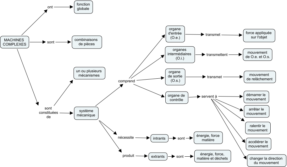 This Concept Map, created with IHMC CmapTools, has information related to: Les machines complexes, système mécanique nécessite intrants, organe de sortie (O.s.) transmet mouvement de relâchement, organes intermédiaires (O.i.) transmettent mouvement de O.e. et O.s., intrants sont énergie, force matière, organe de contrôle servent à arrêter le mouvement, extrants sont énergie, force, matière et déchets, MACHINES COMPLEXES sont constituées de un ou plusieurs mécanismes, organe de contrôle servent à accélérer le mouvement, organe de contrôle servent à démarrer le mouvement, système mécanique comprend organes intermédiaires (O.i.), système mécanique comprend organe d'entrée (O.e.), MACHINES COMPLEXES sont combinaisons de pièces, organe de contrôle servent à ralentir le mouvement, MACHINES COMPLEXES ont fonction globale, système mécanique produit extrants, système mécanique comprend organe de contrôle, organe d'entrée (O.e.) transmet force appliquée sur l'objet, MACHINES COMPLEXES sont constituées de système mécanique, système mécanique comprend organe de sortie (O.s.), organe de contrôle servent à changer la direction du mouvement