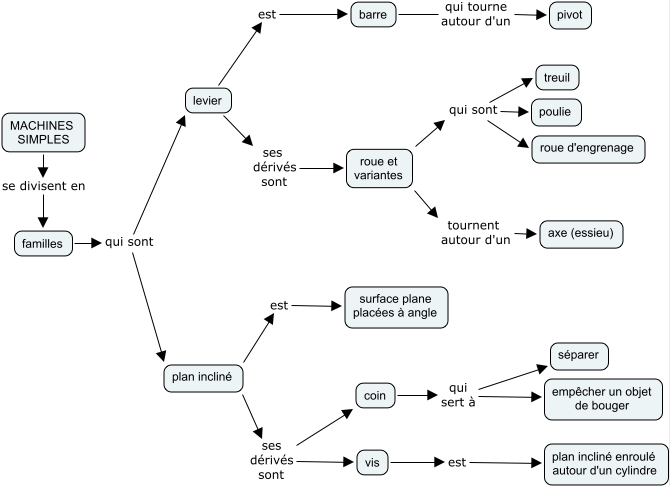 This Concept Map, created with IHMC CmapTools, has information related to: Les machines simples, familles qui sont levier, familles qui sont plan incliné, levier ses dérivés sont roue et variantes, vis est plan incliné enroulé autour d'un cylindre, roue et variantes tournent autour d'un axe (essieu), roue et variantes qui sont poulie, roue et variantes qui sont treuil, barre qui tourne autour d'un pivot, plan incliné ses dérivés sont coin, MACHINES SIMPLES se divisent en familles, coin qui sert à empêcher un objet de bouger, coin qui sert à séparer, roue et variantes qui sont roue d'engrenage, plan incliné est surface plane placées à angle, plan incliné ses dérivés sont vis, levier est barre