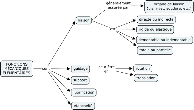 This Concept Map, created with IHMC CmapTools, has information related to: fonctions mécaniques, liaison généralement assurée par organe de liaison (vis, rivet, soudure, etc.), liaison est directe ou indirecte, FONCTIONS MÉCANIQUES ÉLÉMENTAIRES sont étanchéité, guidage peut être en rotation, FONCTIONS MÉCANIQUES ÉLÉMENTAIRES sont support, liaison est rigide ou élastique, liaison est totale ou partielle, guidage peut être en translation, liaison est démontable ou indémontable, FONCTIONS MÉCANIQUES ÉLÉMENTAIRES sont lubrification, FONCTIONS MÉCANIQUES ÉLÉMENTAIRES sont guidage, FONCTIONS MÉCANIQUES ÉLÉMENTAIRES sont liaison