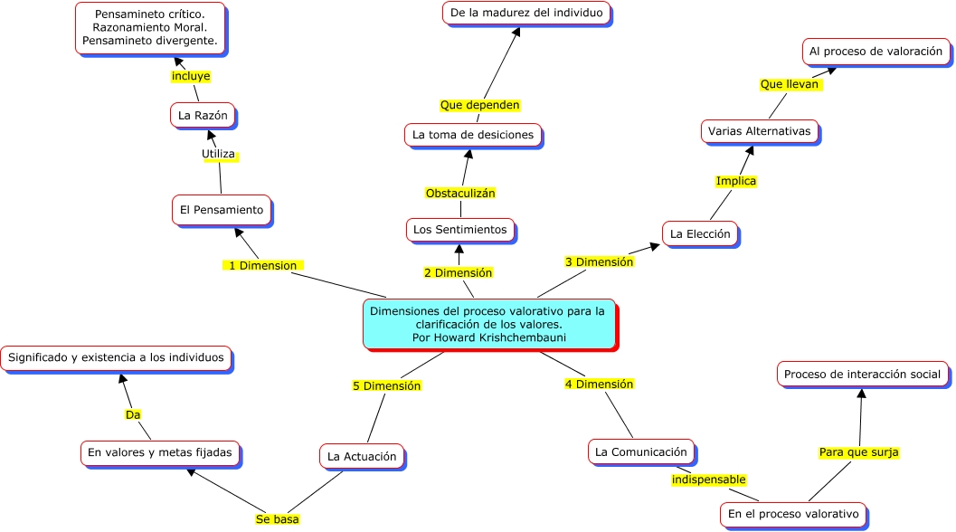 Este Cmap, tiene información relacionada con: axiologia, Dimensiones del proceso valorativo para la clarificación de los valores. Por Howard Krishchembauni 3 Dimensión La Elección, Dimensiones del proceso valorativo para la clarificación de los valores. Por Howard Krishchembauni 1 Dimension El Pensamiento, Los Sentimientos Obstaculizán La toma de desiciones, La Comunicación indispensable En el proceso valorativo, La Elección Implica Varias Alternativas, Varias Alternativas Que llevan Al proceso de valoración, En valores y metas fijadas Da Significado y existencia a los individuos, La toma de desiciones Que dependen De la madurez del individuo, La Razón incluye Pensamineto crítico. Razonamiento Moral. Pensamineto divergente., Dimensiones del proceso valorativo para la clarificación de los valores. Por Howard Krishchembauni 5 Dimensión La Actuación, El Pensamiento Utiliza La Razón, Dimensiones del proceso valorativo para la clarificación de los valores. Por Howard Krishchembauni 4 Dimensión La Comunicación, Dimensiones del proceso valorativo para la clarificación de los valores. Por Howard Krishchembauni 2 Dimensión Los Sentimientos, La Actuación Se basa En valores y metas fijadas, En el proceso valorativo Para que surja Proceso de interacción social