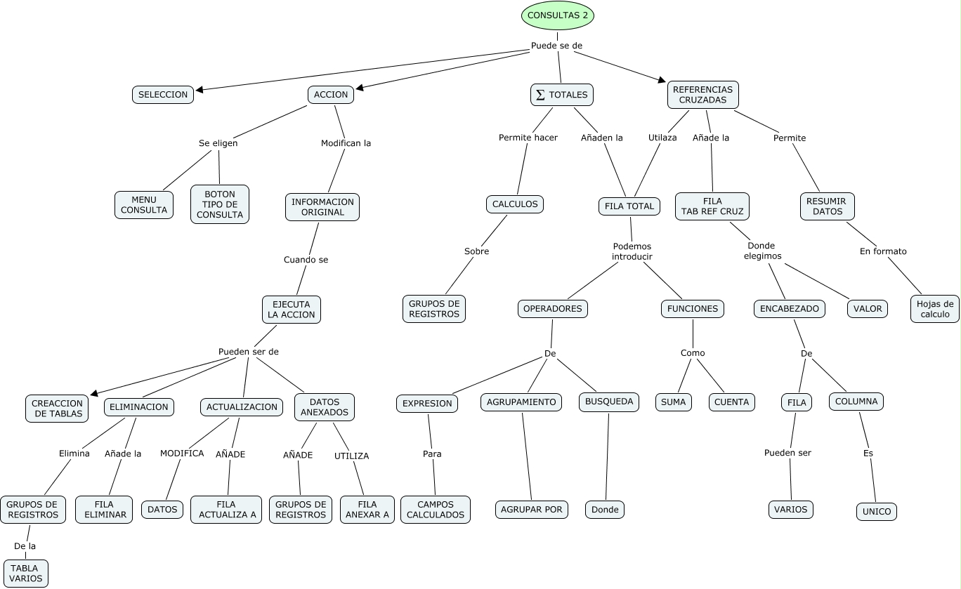 Este Cmap, tiene información relacionada con: OTRAS CONSULTAS, EJECUTA LA ACCION Pueden ser de CREACCION DE TABLAS, EJECUTA LA ACCION Pueden ser de ELIMINACION, ENCABEZADO De COLUMNA, ACCION Se eligen MENU CONSULTA, ELIMINACION Añade la FILA ELIMINAR, ELIMINACION Elimina GRUPOS DE REGISTROS, FILA Pueden ser VARIOS, EXPRESION Para CAMPOS CALCULADOS, OPERADORES De AGRUPAMIENTO, CALCULOS Sobre GRUPOS DE REGISTROS, RESUMIR DATOS En formato Hojas de calculo, ACCION Se eligen BOTON TIPO DE CONSULTA, CONSULTAS 2 Puede se de SELECCION, OPERADORES De EXPRESION, DATOS ANEXADOS UTILIZA FILA ANEXAR A, REFERENCIAS CRUZADAS Permite RESUMIR DATOS, FUNCIONES Como SUMA, REFERENCIAS CRUZADAS Añade la FILA TAB REF CRUZ, COLUMNA Es UNICO, CONSULTAS 2 Puede se de REFERENCIAS CRUZADAS