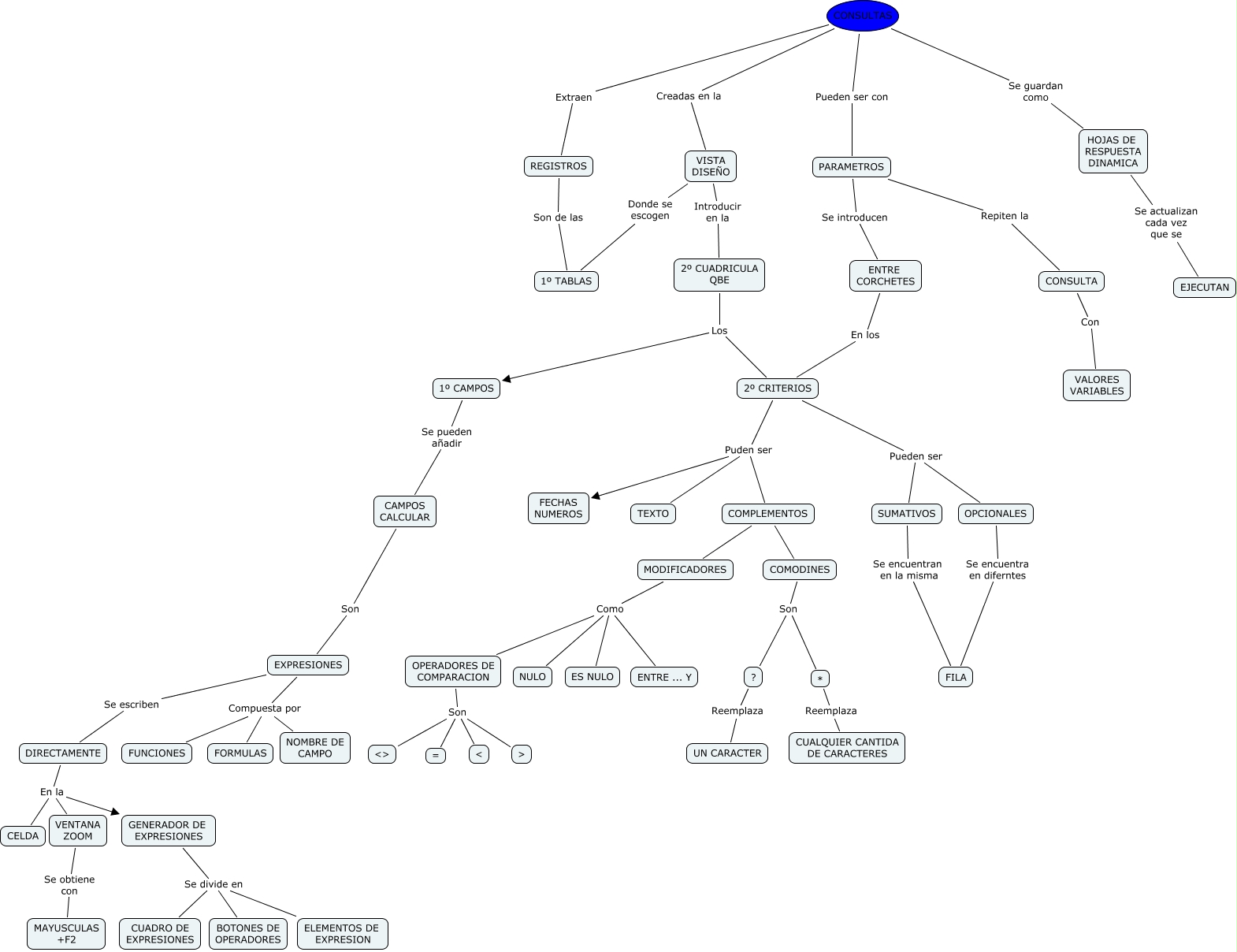 Este Cmap, tiene información relacionada con: CONSULTAS, EXPRESIONES Compuesta por FUNCIONES, DIRECTAMENTE En la CELDA, CAMPOS CALCULAR Son EXPRESIONES, VISTA DISEÑO Introducir en la 2º CUADRICULA QBE, COMPLEMENTOS COMODINES, SUMATIVOS Se encuentran en la misma FILA, EXPRESIONES Compuesta por FORMULAS, PARAMETROS Repiten la CONSULTA, CONSULTAS Creadas en la VISTA DISEÑO, OPERADORES DE COMPARACION Son =, 2º CRITERIOS Pueden ser SUMATIVOS, GENERADOR DE EXPRESIONES Se divide en ELEMENTOS DE EXPRESION, OPERADORES DE COMPARACION Son >, * Reemplaza CUALQUIER CANTIDA DE CARACTERES, CONSULTAS Se guardan como HOJAS DE RESPUESTA DINAMICA, CONSULTAS Pueden ser con PARAMETROS, CONSULTAS Extraen REGISTROS, MODIFICADORES Como ENTRE ... Y, ? Reemplaza UN CARACTER, GENERADOR DE EXPRESIONES Se divide en BOTONES DE OPERADORES