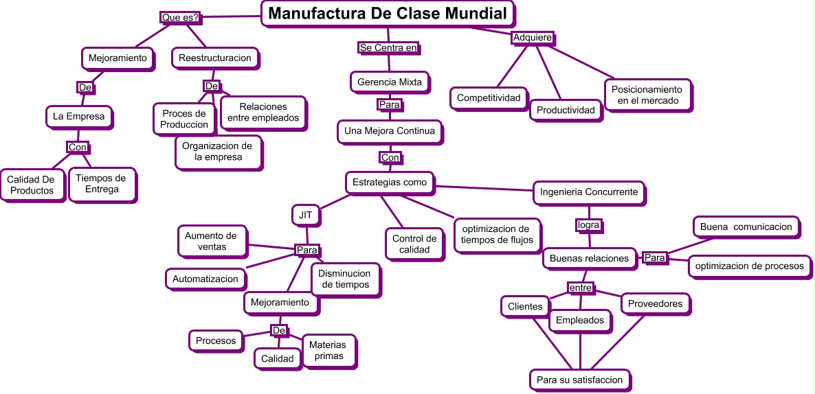 Este Cmap, tiene información relacionada con: Manufactura de clase mundial, Mejoramiento De Procesos, Buenas relaciones entre Empleados, JIT Para Automatizacion, Mejoramiento De La Empresa, JIT Para Aumento de ventas, Manufactura De Clase Mundial Que es? Reestructuracion, Manufactura De Clase Mundial Que es? Mejoramiento, Estrategias como ???? Control de calidad, Buenas relaciones entre Clientes, JIT Para Mejoramiento, Gerencia Mixta Para Una Mejora Continua, Mejoramiento De Materias primas, Buenas relaciones entre Proveedores, Estrategias como ???? JIT, La Empresa Con Tiempos de Entrega, La Empresa Con Calidad De Productos, Estrategias como ???? optimizacion de tiempos de flujos, Ingenieria Concurrente logra Buenas relaciones, Una Mejora Continua Con Estrategias como, Estrategias como ???? Ingenieria Concurrente