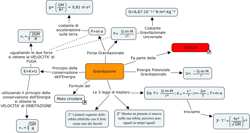 Questa Cmap, creata con IHMC CmapTools, contiene informazioni relative a: Gravitazione, F=m·a costante di accelerazione sulla terra <math xmlns="http://www.w3.org/1998/Math/MathML"> <mrow> <mtext> g= </mtext> <mfenced open="(" close=")"> <mfrac> <mtext> GM </mtext> <mtext> R² </mtext> </mfrac> </mfenced> <mtext> = 9,81 m·s² </mtext> </mrow> </math>, E=K+U utilizzando il principio della conservazione dell'Energia si ottiene la VELOCITA' di ORBITAZIONE <math xmlns="http://www.w3.org/1998/Math/MathML"> <mrow> <mmultiscripts> <mtext> v </mtext> <mtext> o </mtext> <none/> </mmultiscripts> <mtext> = </mtext> <msqrt> <mtext> GM