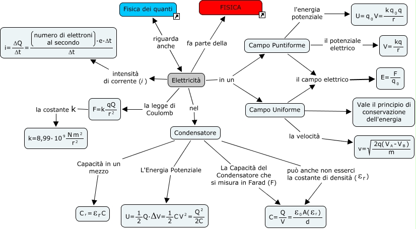 al secondo </mtext> </mfenced> <mtext> ⋅e⋅Δt </mtext> </mrow> <mtext> Δt </mtext> </mfrac> </mrow> </math>, Campo Puntiforme il potenziale elettrico <math xmlns="http://www.w3.org/1998/Math/MathML"> <mrow> <mtext> V= </mtext> <mfrac> <mtext> kq </mtext> <mtext> r </mtext> </mfrac> </mrow> </math>, Elettricità in un Campo Puntiforme, Campo Puntiforme l'energia potenziale <math xmlns="http://www.w3.org/1998/Math/MathML"> <mrow> <mtext> U= </mtext> <mmultiscripts> <mtext> q </mtext> <mtext> 0 </mtext> <none/> </mmultiscripts> <mtext> V= </mtext> <mfrac> <mrow> <mtext> k </mtext> <mmultiscripts> <mtext> q </mtext> <mtext> 0 </mtext> <none/> </mmultiscripts> <mtext> q </mtext> </mrow> <mtext> r </mtext> </mfrac> </mrow> </math>, Elettricità fa parte della FISICA, Elettricità la legge di Coulomb <math xmlns="http://www.w3.org/1998/Math/MathML"> <mrow> <mtext> F=k </mtext> <mfrac> <mtext> qQ </mtext> <mmultiscripts> <mtext> r </mtext> <none/> <mtext> 2 </mtext> </mmultiscripts> </mfrac> </mrow> </math>, Campo Uniforme la velocità <math xmlns="http://www.w3.org/1998/Math/MathML"> <mrow> <mtext> v= </mtext> <msqrt> <mfrac> <mrow> <mtext> 2q( </mtext> <mmultiscripts> <mtext> V </mtext> <mtext> A </mtext> <none/> </mmultiscripts> <mtext> - </mtext> <mmultiscripts> <mtext> V </mtext> <mtext> B </mtext> <none/> </mmultiscripts> <mtext> ) </mtext> </mrow> <mtext> m </mtext> </mfrac> </msqrt> </mrow> </math>, <math xmlns="http://www.w3.org/1998/Math/MathML"> <mrow> <mtext> F=k </mtext> <mfrac> <mtext> qQ </mtext> <mmultiscripts> <mtext> r </mtext> <none/> <mtext> 2 </mtext> </mmultiscripts> </mfrac> </mrow> </math> la costante k <math xmlns="http://www.w3.org/1998/Math/MathML"> <mrow> <mtext> k=8,99⋅ </mtext> <mmultiscripts> <mtext> 10 </mtext> <none/> <mtext> 9 </mtext> </mmultiscripts> <mfrac> <mrow> <mtext> N </mtext> <mmultiscripts> <mtext> m </mtext> <none/> <mtext> 2 </mtext> </mmultiscripts> </mrow> <mmultiscripts> <mtext> r </mtext> <none/> <mtext> 2 </mtext> </mmultiscripts> </mfrac> </mrow> </math>, Elettricità in un Campo Uniforme, Condensatore L'Energia Potenziale <math xmlns="http://www.w3.org/1998/Math/MathML"> <mrow> <mtext> U= </mtext> <mfrac> <mtext> 1 </mtext> <mtext> 2 </mtext> </mfrac> <mtext> Q⋅ΔV= </mtext> <mfrac> <mtext> 1 </mtext> <mtext> 2 </mtext> </mfrac> <mtext> C </mtext> <mmultiscripts> <mtext> V </mtext> <none/> <mtext> 2 </mtext> </mmultiscripts> <mtext> = </mtext> <mfrac> <mmultiscripts> <mtext> Q </mtext> <none/> <mtext> 2 </mtext> </mmultiscripts> <mtext> 2C </mtext> </mfrac> </mrow> </math>, Campo Uniforme il campo elettrico <math xmlns="http://www.w3.org/1998/Math/MathML"> <mrow> <mtext> E= </mtext> <mfrac> <mtext> F </mtext> <mmultiscripts> <mtext> q </mtext> <mtext> 0 </mtext> <none/> </mmultiscripts> </mfrac> </mrow> </math>, Elettricità nel Condensatore, Condensatore Capacità in un mezzo <math xmlns="http://www.w3.org/1998/Math/MathML"> <mrow> <mmultiscripts> <mtext> C </mtext> <mtext> r </mtext> <none/> </mmultiscripts> <mtext> = </mtext> <mmultiscripts> <mtext> ε </mtext> <mtext> r </mtext> <none/> </mmultiscripts> <mtext> C </mtext> </mrow> </math>, Condensatore <math xmlns="http://www.w3.org/1998/Math/MathML"> <mrow> <mtext> può anche non esserci