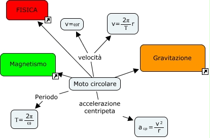 Questa Cmap, creata con IHMC CmapTools, contiene informazioni relative a: Moto circolare, Moto circolare Periodo <math xmlns="http://www.w3.org/1998/Math/MathML"> <mrow> <mtext> Τ= </mtext> <mfrac> <mtext> 2π </mtext> <mtext> ω </mtext> </mfrac> </mrow> </math>, Moto circolare ???? FISICA, Moto circolare velocità <math xmlns="http://www.w3.org/1998/Math/MathML"> <mrow> <mtext> v= </mtext> <mfrac> <mtext> 2π </mtext> <mtext> Τ </mtext> </mfrac> <mtext> r </mtext> </mrow> </math>, Moto circolare ???? Gravitazione, Moto circolare ???? Magnetismo, Moto circolare accelerazione centripeta <math xmlns="http://www.w3.org/1998/Math/MathML"> <mrow> <mmultiscripts> <mtext> a </mtext> <mtext> cp </mtext> <none/> </mmultiscripts> <mtext> = </mtext> <mfrac> <mmultiscripts> <mtext> v </mtext> <none/> <mtext> 2 </mtext> </mmultiscripts> <mtext> r </mtext> </mfrac> </mrow> </math>, Moto circolare velocità v=ωr