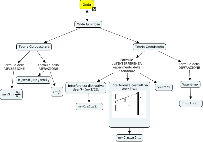 Questa Cmap, creata con IHMC CmapTools, contiene informazioni relative a: Onde luminose, Onde luminose ???? Teoria Corpuscolare, Onde luminose ???? Teoria Ondulatoria, Teoria Ondulatoria Formula della DIFFRAZIONE Wsenϑ=mλ, Teoria Ondulatoria Formule dell'INTERFERENZA esperimento delle 2 fenditure y=Ltanϑ, Teoria Corpuscolare Formula della RIFLESSIONE <math xmlns="http://www.w3.org/1998/Math/MathML"> <mrow> <mtext> sen </mtext> <mmultiscripts> <mtext> ϑ </mtext> <mtext> 1 </mtext> <none/> </mmultiscripts> <mtext> = </mtext> <mfrac> <mmultiscripts> <mtext> n </mtext> <mtext> 2 </mtext> <none/> </mmultiscripts> <mmultiscripts> <mtext> n </mtext> <mtext> 1 </mtext> <none/> </mmultiscripts> </mfrac> </mrow> </math>, Teoria Corpuscolare Formule della RIFRAZIONE <math xmlns="http://www.w3.org/1998/Math/MathML"> <mrow> <mmultiscripts> <mtext> n </mtext> <mtext> 1 </mtext> <none/> </mmultiscripts> <mtext> sen </mtext> <mmultiscripts> <mtext> ϑ </mtext> <mtext> 1 </mtext> <none/> </mmultiscripts> <mtext> = </mtext> <mmultiscripts> <mtext> n </mtext> <mtext> 2 </mtext> <none/> </mmultiscripts> <mtext> sen </mtext> <mmultiscripts> <mtext> ϑ </mtext> <mtext> 2 </mtext> <none/> </mmultiscripts> </mrow> </math>, Wsenϑ=mλ ???? m=±1,±2,..., Teoria Corpuscolare Formule della RIFRAZIONE <math xmlns="http://www.w3.org/1998/Math/MathML"> <mrow> <mtext> v= </mtext> <mfrac> <mtext> c </mtext> <mtext> n </mtext> </mfrac> </mrow> </math>, Teoria Ondulatoria Formule dell'INTERFERENZA esperimento delle 2 fenditure Interferenza costruttiva dsenϑ=mλ, Onde ???? Onde luminose, <math xmlns="http://www.w3.org/1998/Math/MathML"> <mrow> <mtext> Interferenza distruttiva