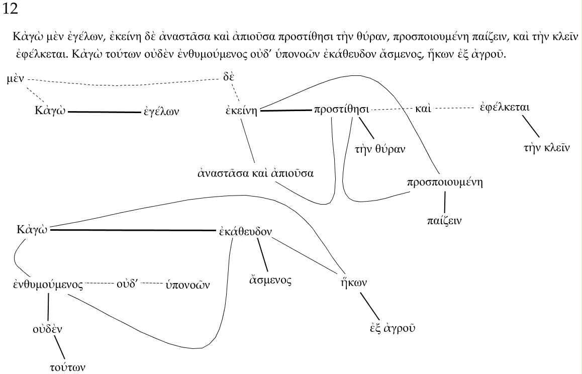 Este Cmap, tiene información relacionada con: frag.12 imprimir, Κἀγὼ ???? ἐκάθευδον, προσποιουμένη ???? προστίθησι, ἐγέλων ???? Κἀγὼ, ἀναστᾶσα καὶ ἀπιοῦσα ???? ἐκείνη, ἥκων ???? Κἀγὼ, μὲν ???? δὲ, Κἀγὼ ???? ἐνθυμούμενος, ἐκείνη ???? προστίθησι, τὴν θύραν ???? προστίθησι, δὲ ???? ἐκείνη, ἀναστᾶσα καὶ ἀπιοῦσα ???? προστίθησι, τούτων ???? οὐδὲν, τὴν κλεῖν ???? ἐφέλκεται, μὲν ???? Κἀγὼ, καὶ ???? προστίθησι, οὐδ’ ???? ἐνθυμούμενος, ἄσμενος ???? ἐκάθευδον, προσποιουμένη ???? παίζειν, ἐνθυμούμενος ???? ἐκάθευδον, ἐφέλκεται ???? καὶ