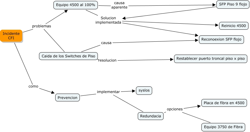Este Cmap, tiene información relacionada con: CFI Incidente, Prevencion implementar syslos, Incidente CFI problemas Caida de los Switches de Piso, Incidente CFI problemas Equipo 4500 al 100%, Caida de los Switches de Piso resolucion Restablecer puerto troncal piso x piso, Caida de los Switches de Piso causa Reconoexion SFP flojo, Equipo 4500 al 100% Solucion implementada Reinicio 4500, Prevencion implementar Redundacia, Redundacia opciones Equipo 3750 de Fibra, Equipo 4500 al 100% Solucion implementada Reconoexion SFP flojo, Redundacia opciones Placa de fibra en 4500, Equipo 4500 al 100% causa aparente SFP Piso 9 flojo, Incidente CFI como Prevencion, SFP Piso 9 flojo Solucion implementada Reinicio 4500, SFP Piso 9 flojo Solucion implementada Reconoexion SFP flojo