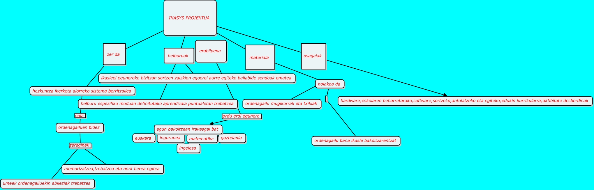 Este Cmap, tiene información relacionada con: ibai2, erabilpena ordu erdi egunero egun bakoitzean irakasgai bat, IKASYS PROIEKTUA osagaiak hardware;eskolaren beharretarako,software;sortzeko,antolatzeko eta egiteko;edukin kurrikularra;aktibitate desberdinak, IKASYS PROIEKTUA materiala nolakoa da, IKASYS PROIEKTUA zer da hezkuntza ikerketa alorreko sistema berritzailea, IKASYS PROIEKTUA helburuak helburu espezifiko moduan definitutako aprendizaia puntualetan trebatzea, hezkuntza ikerketa alorreko sistema berritzailea nola ordenagailuen bidez, ordenagailu mugikorrak eta txikiak nolakoa da, ordenagailuen bidez zereginak memorizatzea,trebatzea eta nork berea egitea, nolakoa da ordenagailu bana ikasle bakoitzarentzat, IKASYS PROIEKTUA helburuak ikasleei eguneroko bizitzan sortzen zaizkion egoerei aurre egiteko baliabide sendoak ematea, ordenagailuen bidez zereginak umeek ordenagailuekin abileziak trebatzea