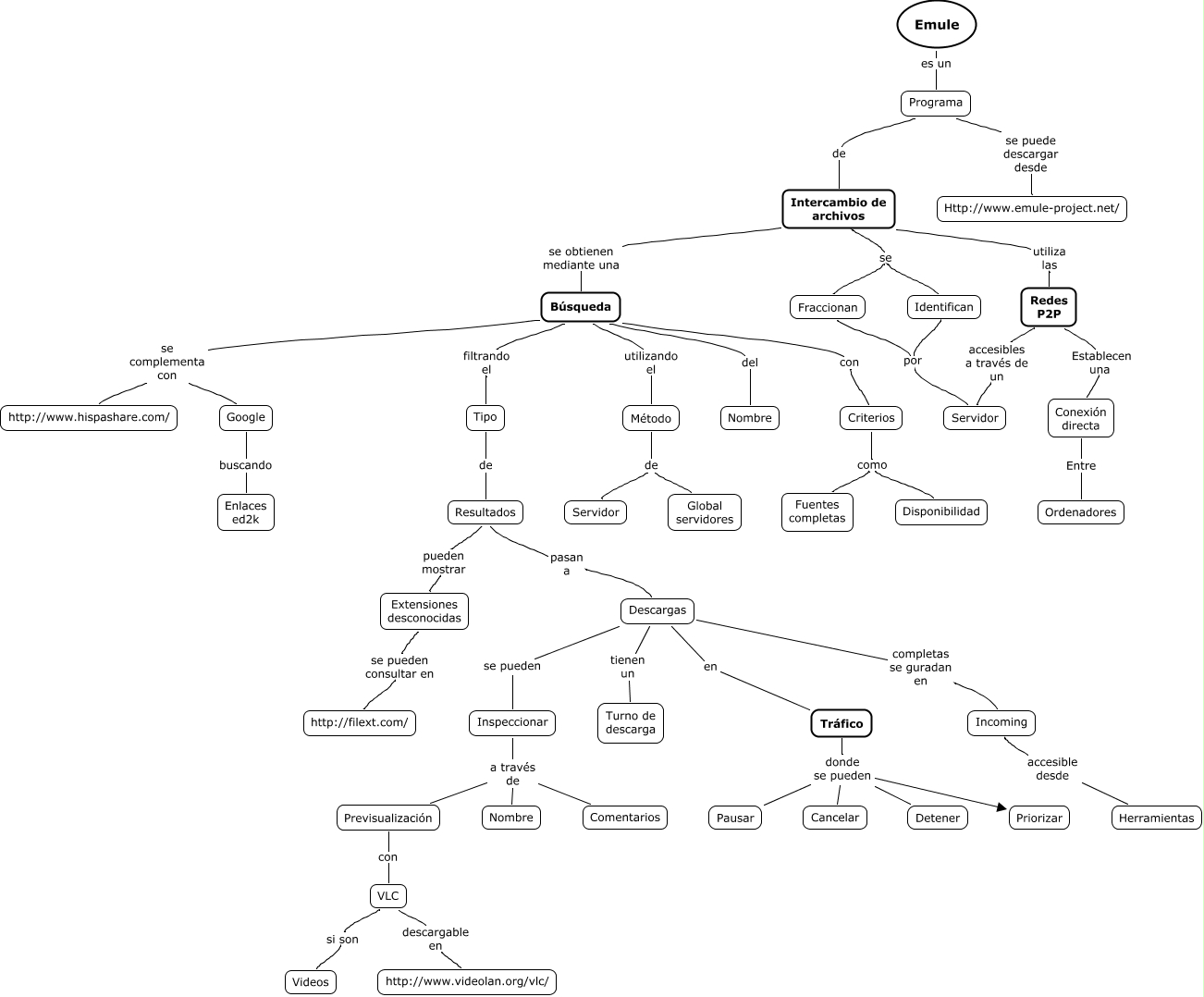 Este Cmap, tiene información relacionada con: Emule, Fraccionan por Servidor, Descargas en Tráfico, Búsqueda se complementa con http://www.hispashare.com/, Resultados pueden mostrar Extensiones desconocidas, Intercambio de archivos se Identifican, Descargas completas se guradan en Incoming, Inspeccionar a través de Previsualización, Incoming accesible desde Herramientas, Tráfico donde se pueden Detener, Redes P2P accesibles a través de un Servidor, Emule es un Programa, Descargas tienen un Turno de descarga, Tráfico donde se pueden Cancelar, Intercambio de archivos se obtienen mediante una Búsqueda, Tráfico donde se pueden Priorizar, Conexión directa Entre Ordenadores, Inspeccionar a través de Comentarios, Búsqueda filtrando el Tipo, Programa de Intercambio de archivos, Intercambio de archivos se Fraccionan
