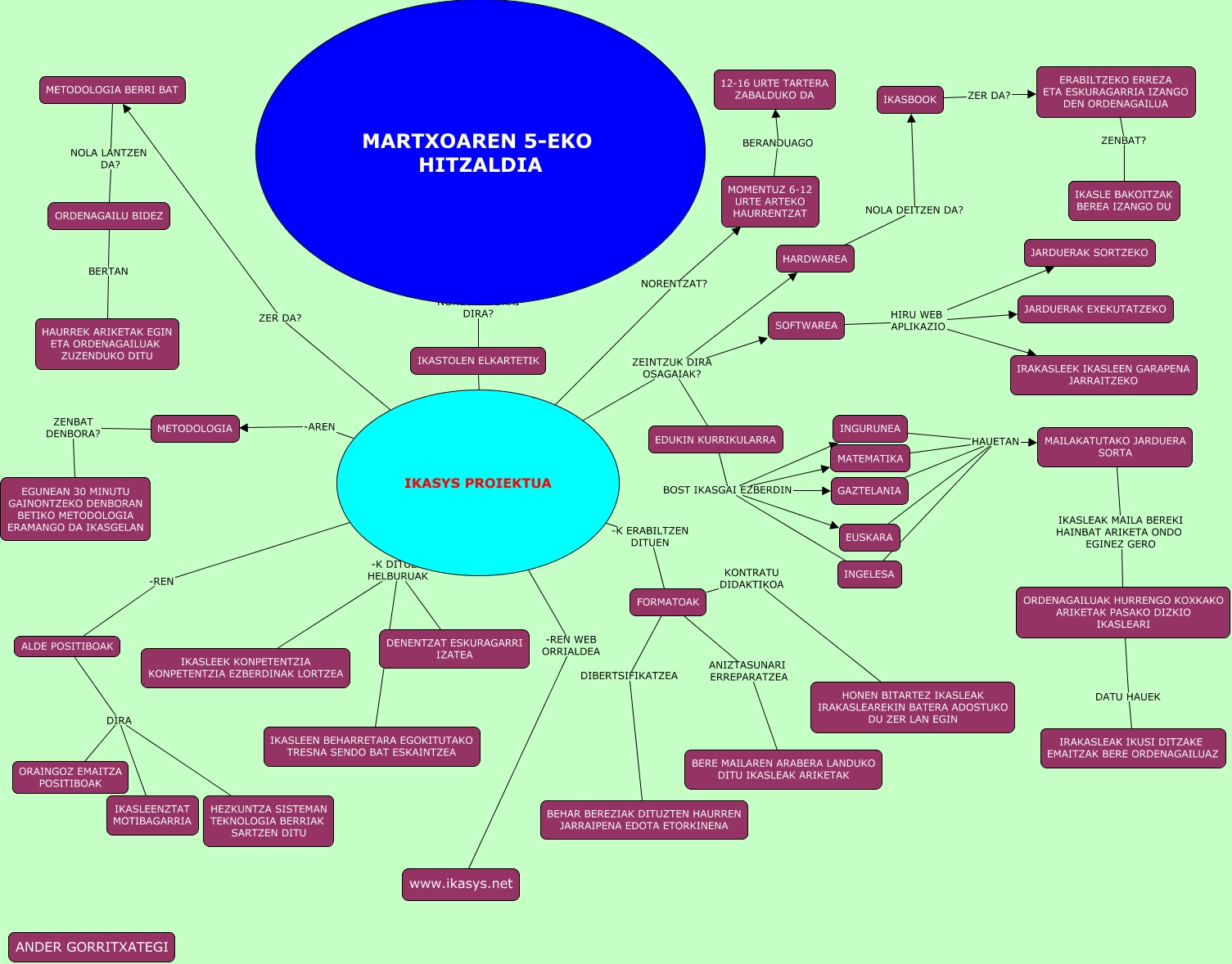 Este Cmap, tiene información relacionada con: MAPA KONTZEPTUALA IKASYS, FORMATOAK ANIZTASUNARI ERREPARATZEA BERE MAILAREN ARABERA LANDUKO DITU IKASLEAK ARIKETAK, IKASTOLEN ELKARTETIK ZER AZALTZEKO? IKASYS PROIEKTUA, METODOLOGIA BERRI BAT NOLA LANTZEN DA? ORDENAGAILU BIDEZ, IKASYS PROIEKTUA ZEINTZUK DIRA OSAGAIAK? EDUKIN KURRIKULARRA, GAZTELANIA HAUETAN MAILAKATUTAKO JARDUERA SORTA, SOFTWAREA HIRU WEB APLIKAZIO IRAKASLEEK IKASLEEN GARAPENA JARRAITZEKO, IKASYS PROIEKTUA -K DITUEN HELBURUAK IKASLEEN BEHARRETARA EGOKITUTAKO TRESNA SENDO BAT ESKAINTZEA, IKASYS PROIEKTUA -AREN METODOLOGIA, IKASYS PROIEKTUA ZEINTZUK DIRA OSAGAIAK? SOFTWAREA, ALDE POSITIBOAK DIRA IKASLEENZTAT MOTIBAGARRIA, IKASYS PROIEKTUA -REN WEB ORRIALDEA www.ikasys.net, INGURUNEA HAUETAN MAILAKATUTAKO JARDUERA SORTA, MARTXOAREN 5-EKO HITZALDIA NONDIK ETORRI DIRA? IKASTOLEN ELKARTETIK, METODOLOGIA ZENBAT DENBORA? EGUNEAN 30 MINUTU GAINONTZEKO DENBORAN BETIKO METODOLOGIA ERAMANGO DA IKASGELAN, FORMATOAK DIBERTSIFIKATZEA BEHAR BEREZIAK DITUZTEN HAURREN JARRAIPENA EDOTA ETORKINENA, IKASYS PROIEKTUA ZEINTZUK DIRA OSAGAIAK? HARDWAREA, MAILAKATUTAKO JARDUERA SORTA IKASLEAK MAILA BEREKI HAINBAT ARIKETA ONDO EGINEZ GERO ORDENAGAILUAK HURRENGO KOXKAKO ARIKETAK PASAKO DIZKIO IKASLEARI, MOMENTUZ 6-12 URTE ARTEKO HAURRENTZAT BERANDUAGO 12-16 URTE TARTERA ZABALDUKO DA, ORDENAGAILU BIDEZ BERTAN HAURREK ARIKETAK EGIN ETA ORDENAGAILUAK ZUZENDUKO DITU, MATEMATIKA HAUETAN MAILAKATUTAKO JARDUERA SORTA