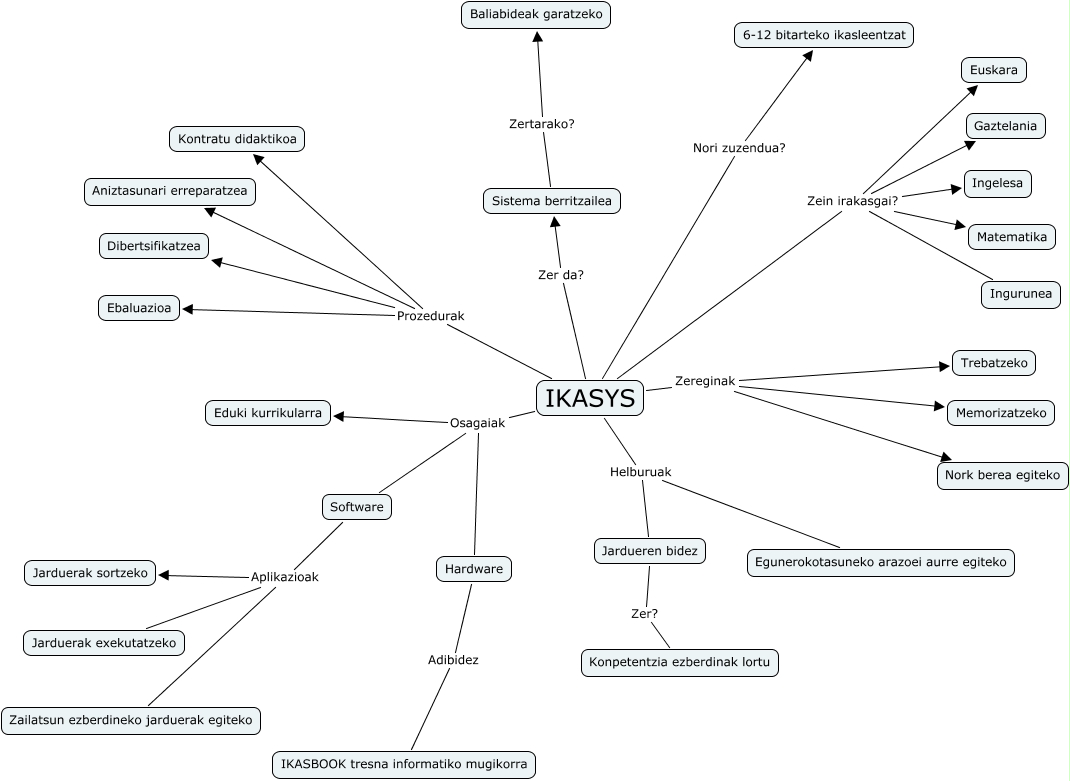 Este Cmap, tiene información relacionada con: Ikasys Maitane, IKASYS Helburuak Jardueren bidez, IKASYS Prozedurak Ebaluazioa, Software Aplikazioak Jarduerak exekutatzeko, Sistema berritzailea Zertarako? Baliabideak garatzeko, IKASYS Zein irakasgai? Ingelesa, IKASYS Osagaiak Hardware, IKASYS Zein irakasgai? Ingurunea, IKASYS Zereginak Trebatzeko, IKASYS Zein irakasgai? Gaztelania, IKASYS Prozedurak Dibertsifikatzea, IKASYS Zer da? Sistema berritzailea, IKASYS Nori zuzendua? 6-12 bitarteko ikasleentzat, Hardware Adibidez IKASBOOK tresna informatiko mugikorra, IKASYS Prozedurak Kontratu didaktikoa, Software Aplikazioak Jarduerak sortzeko, IKASYS Zein irakasgai? Euskara, IKASYS Helburuak Egunerokotasuneko arazoei aurre egiteko, IKASYS Zein irakasgai? Matematika, IKASYS Osagaiak Software, Jardueren bidez Zer? Konpetentzia ezberdinak lortu