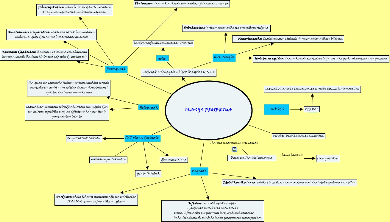 Este Cmap, tiene información relacionada con: gari, IKASYS PROIEKTUA osagaiak Eduki kurrikular ra: arloka eta zailtasunaren arabera mailakatutako jarduera sorta bildu, norberak ordenagailu bidez ikasteko sistema hiru zeregin Trebakuntza: jarduera sistematiko eta progresiboen bilduma, IKASYS PROIEKTUA Prozedurak Kontratu didaktikoa: ikaslearen gaitasuna eta ahalmena kontuan izanik ikaslearekin batera adostuko du zer lan egin, IKASYS PROIEKTUA IKT plana diseinatu dinamizazio lana, IKASYS PROIEKTUA Ikastola elkartean 20 urte lanean Batez ere, Ikastolei zuzendua, IKASYS PROIEKTUA ???? norberak ordenagailu bidez ikasteko sistema, norberak ordenagailu bidez ikasteko sistema hiru zeregin Nork berea egiteko: ikasleak berak ezartzeko eta jarduerak egiteko eskaintzen duen prozesua, IKASYS PROIEKTUA Helburuak ikasgelan eta eguneroko bizitzan sortzen zaizkion egoerak ulertzeko eta horiei aurre egiteko, ikasleari bere beharrei egokitutako tresna sendoak eman, IKASYS PROIEKTUA IKT plana diseinatu irakasleen prestakuntza, IKASYS PROIEKTUA IKASYS ZER DA?, IKASYS PROIEKTUA IKT plana diseinatu konpetentziak finkatu, IKASYS PROIEKTUA Prozedurak Dibertsifikatzea: behar bereziak dituzten ikasleen jarraipenean edota etorkinen beharrei lagundu, ZER DA? ???? ikasleak oinarrizko konpetentziak lortzeko sistema berriztatzailea, norberak ordenagailu bidez ikasteko sistema nola? hardware,software eta edukiak) uztartuz, IKASYS PROIEKTUA osagaiak Software: hiru web aplikazio ditu: - jarduerak sortzeko eta antolatzeko - tresna informatiko mugikorrean jarduerak exekutatzeko - irakasleek ikasleek egindako lanen garapenaren jarraipenekoa, IKASYS PROIEKTUA ???? Proiektu kurrikularrean oinarritua, IKASYS PROIEKTUA IKT plana diseinatu giza baliabideak, norberak ordenagailu bidez ikasteko sistema hiru zeregin Memorizatzeko: Ikaskuntzaren edukiak jarduera sistematikoen bilduma, IKASYS PROIEKTUA osagaiak Hardware: eskola beharrei erantzungo die eta erabiltzeko IKASBOOK tresna informatiko mugikorra, IKASYS PROIEKTUA Prozedurak Aniztasunari erreparatzea: ikasle bakoitzak bere mailaren arabera landuko ditu aurrez hitzartutako ariketak